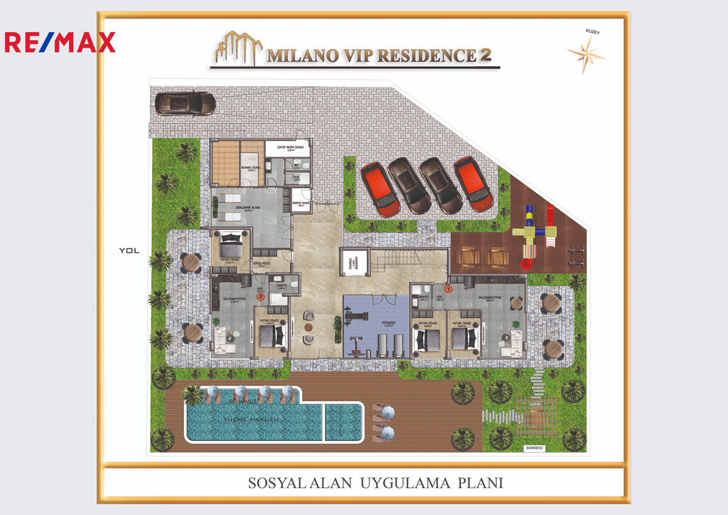 Individuálně navržená velká zahrada pro relaxaci, sportovní hřiště na zahradě, rekreační oblast a gril, dětské hřiště, venkovní bazén, dětský bazén, sauna, parní lázeň, fitness centrum / tělocvična, dětská herna, video monitorovací systém, kulečník a stolní tenis, parkování.