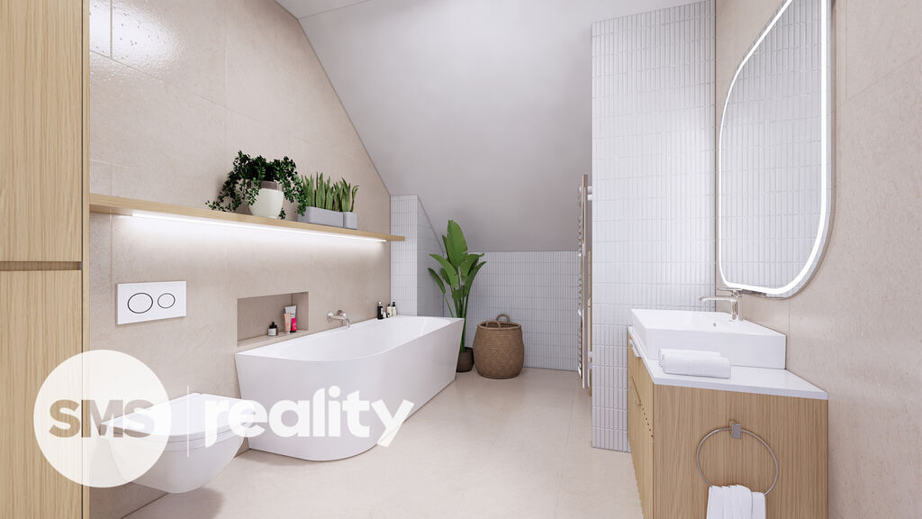 - Horní patro (2+kk, 49,5 m²) – obývací pokoj s kuchyňským koutem, ložnice a koupelna. Přístup přes společnou chodbu.