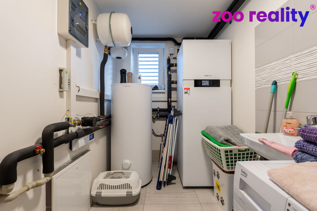 O vytápění a ohřev vody se stará nové tepelné čerpadlo v kombinaci s elektrickým boilerem. Teplo je po domě řešeno podlahovým vytápěním, které je v obou patrech. Energetická náročnost domu je B. Splachování toalet je řešeno dešťovou vodou z retenční nádrže. Na všech oknech domu jsou venkovní rolety, které v případě potřeby zajistí úplné soukromí.