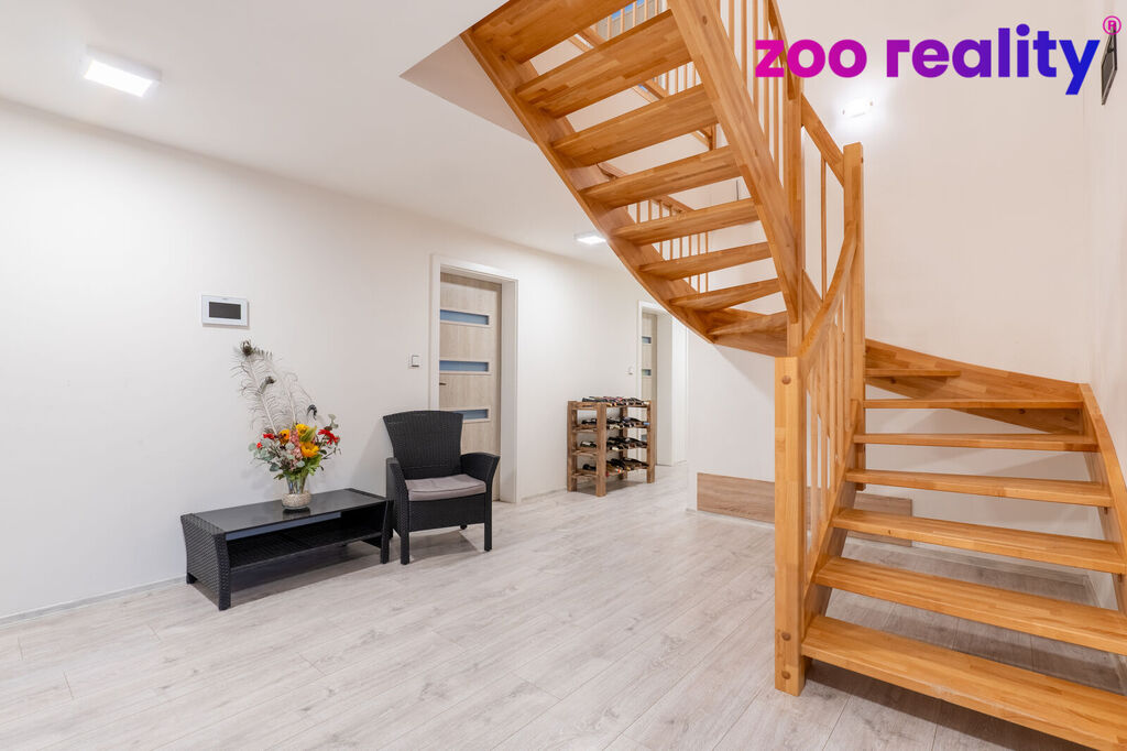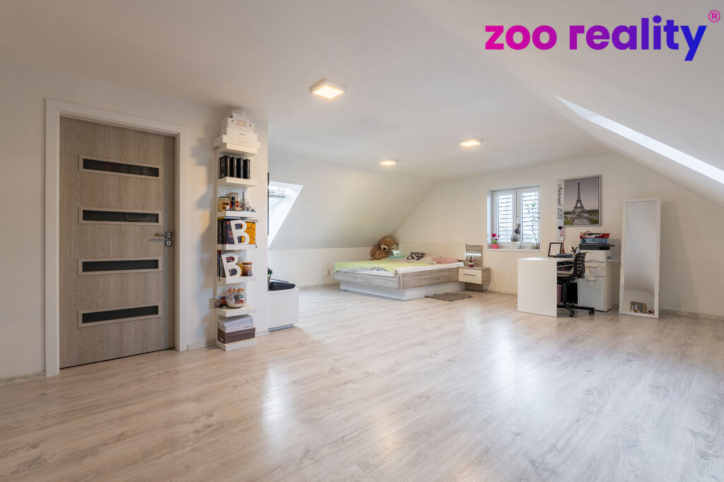 V přízemí domu nalezneme 3 samostatné ložnice, větší a menší koupelnu, obývací pokoj spojený s kuchyní, technickou místnost, garáž a výstup na 30ti metrovou terasu. V prvním patře jsou situovány dva velké pokoje. Jeden o velikosti 22m2 a druhý 38m2 včetně šatny. Samozřejmostí je další koupelna a menší komora. V suterénu domu jsou 3 další místnosti, každá o ploše 25 až 35m2. Nyní využívané jako skald dřeva, dílna a letní kuchyně včetně samostatné toalety. Celý suterén je z betonového monolitu.