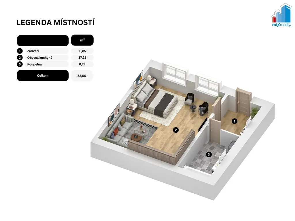 Hledáte skvělou investici, anebo nové bydlení? Naše realitní společnost Vám exkluzivně nabízí ke koupi prostorný byt o dispozici 1+kk v novostavbě moderního bytového domu, který se nachází v centru obce Chotěšov, na ulici Plzeňská. Bytová jednotka o celkové výměře 52,86 m² bude situována v přízemí cihlového domu. Projekt se aktuálně nachází ve fázi výstavby, což Vám stále umožňuje částečně ovlivnit finální podobu interiéru dle Vašich představ. Dispozice bytu zahrnuje vstupní předsíň a prostorný obývací pokoj s kuchyňským koutem, dále koupelnu s možností sprchového koutu či vany a toaletu. K bytu náleží parkovací stání a podíl na příjezdové komunikaci. Komfort bydlení zajistí podlahové vytápění s individuální regulací pomocí termostatů, ohřev vody bude řešen elektrickým bojlerem. Samozřejmostí jsou plastová okna s trojskly, kvalitní podlahové krytiny a moderní sanitární vybavení. Obec Chotěšov nabízí kompletní občanskou vybavenost včetně školy, školky (cca 5 minut chůze), obchodů a dalších služeb. Výhodou je také velmi dobrá dopravní dostupnost díky autobusové i vlakové dopravě. V případě zájmu Vám rádi pomůžeme s vyřízením hypotečního úvěru a zajistíme kompletní servis spojený s koupí nemovitosti.