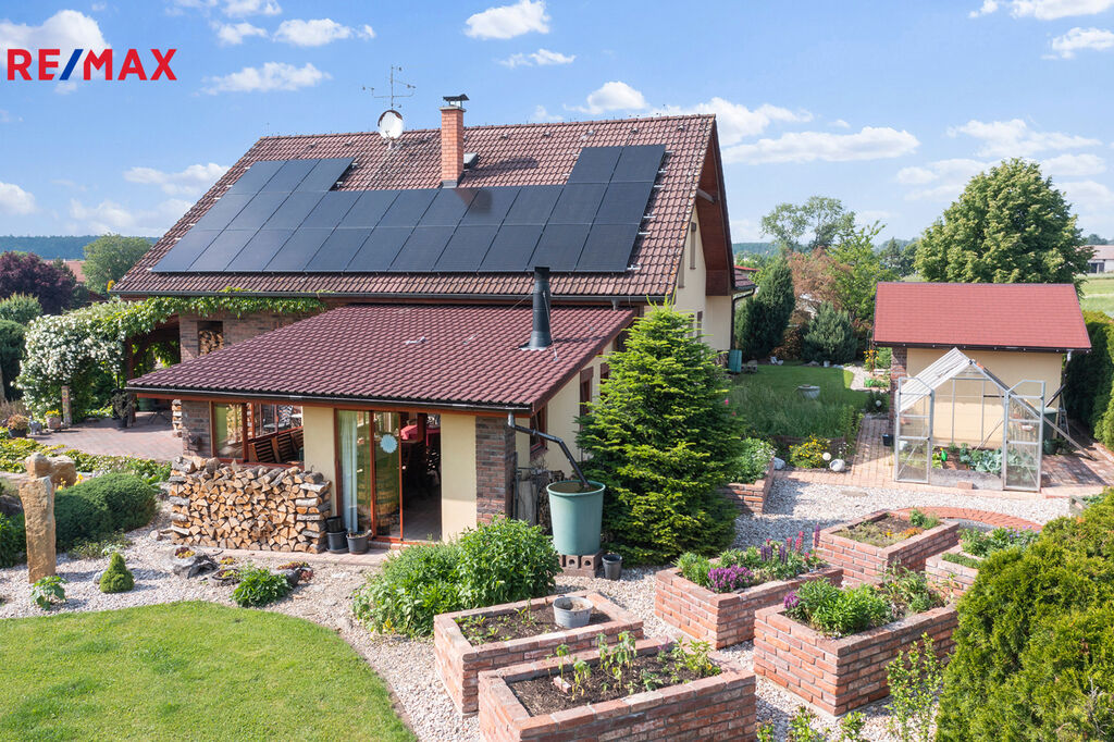Vytápění a ohřev teplé vody zajišťuje plynový kotel Geminox umístěný v technické místnosti a napojený na ústřední topení. Dům je energeticky velmi efektivní díky fotovoltaickému systému.