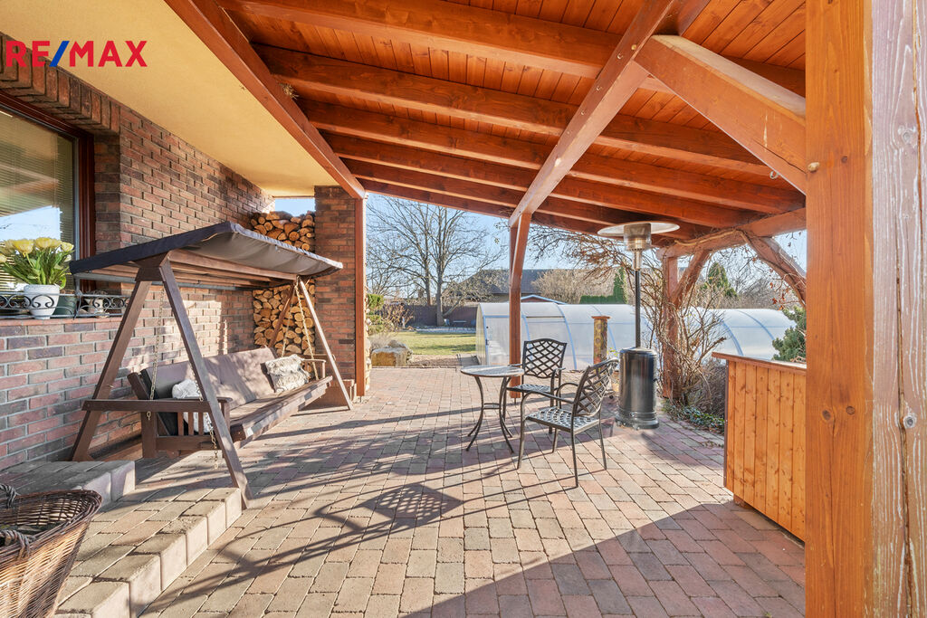 K domu je z jedné strany připojena prostorná garáž, která bez problémů pojme dvě vozidla. Díky propojení s domem je zajištěn pohodlný přístup za jakéhokoli počasí. Na druhé straně domu se nachází letní kuchyň s krbem, ideální pro venkovní vaření a posezení.