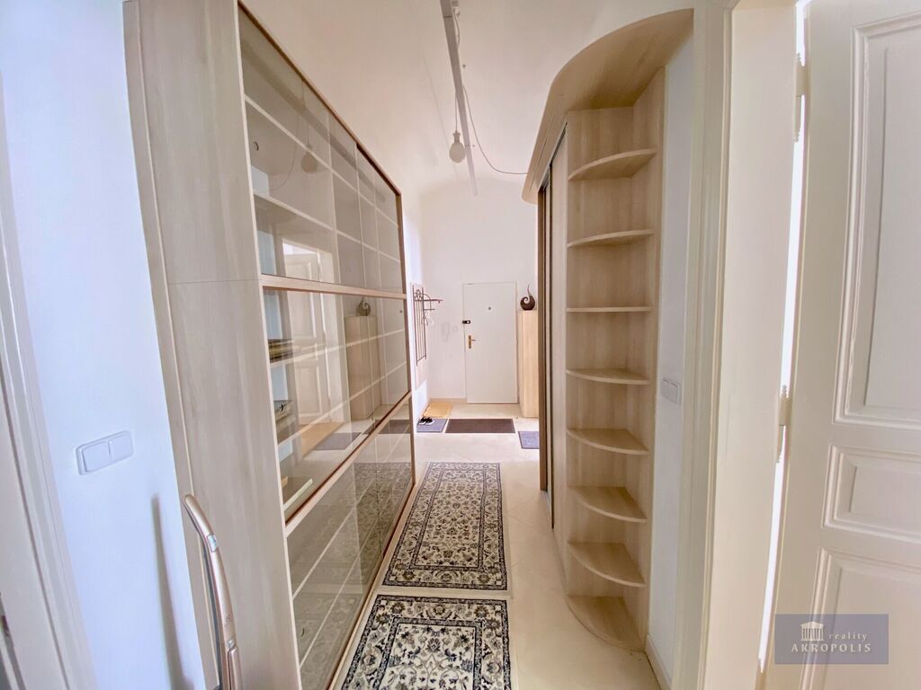 Byt disponuje velkorysým úložným prostorem díky vestavěným skříním. Díky umístění ve vyšším podlaží je velmi světlý, s orientací oken na východ a západ. V chodbě se nachází prostorná knihovna, která může sloužit k uložení knih nebo vystavení dekorací. Celkově byt nabízí elegantní bydlení v centru Prahy s kompletním zázemím a možností úpravy vybavení dle dohody.