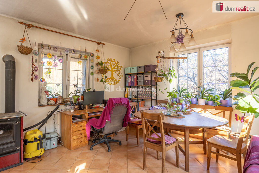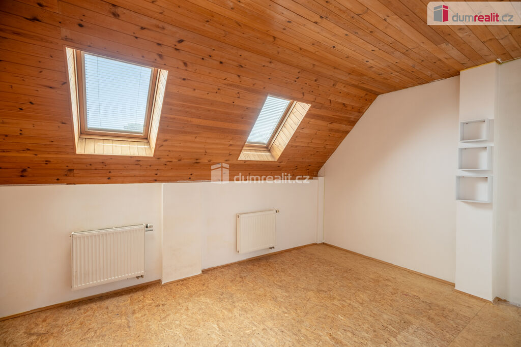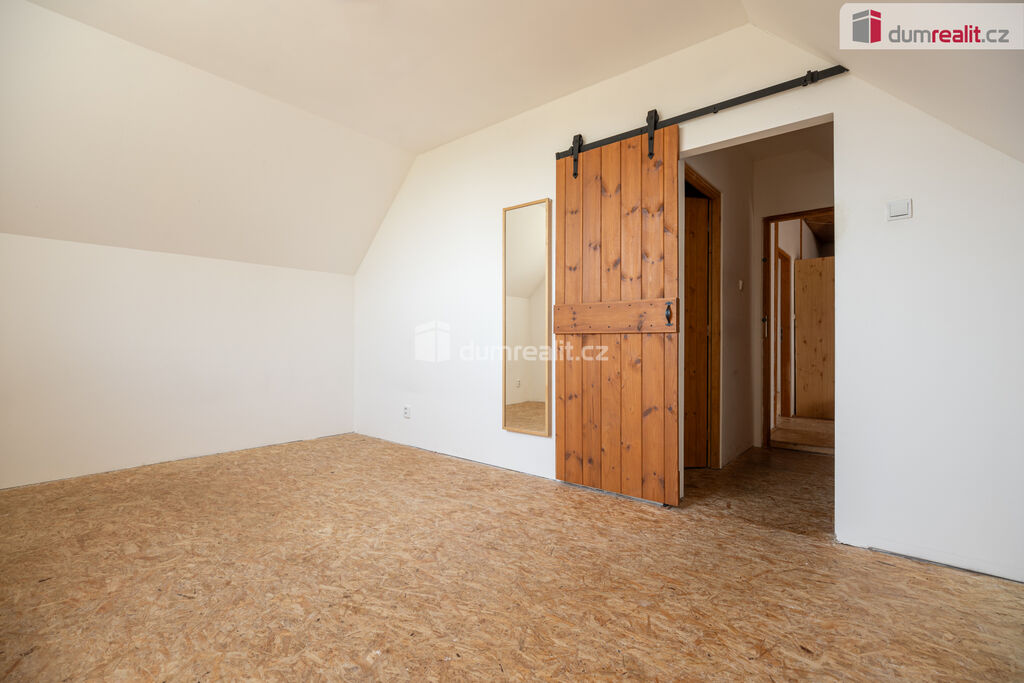 V patře jsou další tři pokoje, prostorná hala, komora a toaleta. Z největšího pokoje je krásný výhled do zahrady a do kraje, kde se na tyčí hora Říp.