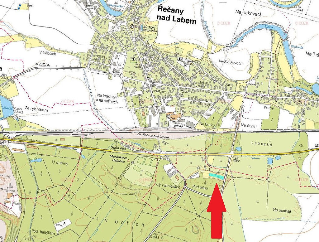 Na pozemku dřevěný sklad, využívaný jako chata a malý sklep. Územním plánem pozemek označen jako SV – plochy smíšené obytné. Vodovod ani kanalizace v místě není, nutno řešit studnou a septikem. Pozemek v katastru Zdechovice, ale v blízkosti obce Řečany nad Labem.