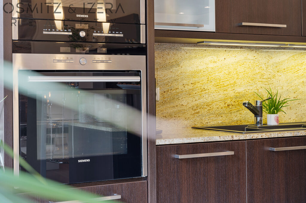 Atypicky řešená dispozice bytu 3+kk je doplněna o samostatnou šatnu. Dále je u kuchyňského koutu k dispozici komora sloužící i jako prádelna. V bytě jsou dvě prostorné koupelny. Všechny místnosti jsou přístupné ze vstupní haly. Velký, jižně orientovaný, obývací pokoj o ploše 48 m2 s prosklenou stěnou je vkusně vybaven na míru zhotoveným nábytkem. Okna obou ložnic jsou orientována na sever pro příjemné klima na spaní. Architektonické a designové řešení, povrchů stěn, podlah a sladění s atypickým nábytkem měl na starosti ateliér ZAKI Design. Byt si vyhlédli i redaktoři trendového časopisu a věnovali mu několik stran jako vzoru zdařilé luxusní rekonstrukce bytu ve starší zástavbě pražských Strašnic. K příjemnému pocitu ze vzdušného a světlého prostoru bytu přispívají také v dnešních novostavbách nedostupné vysoké stropy původního domu.