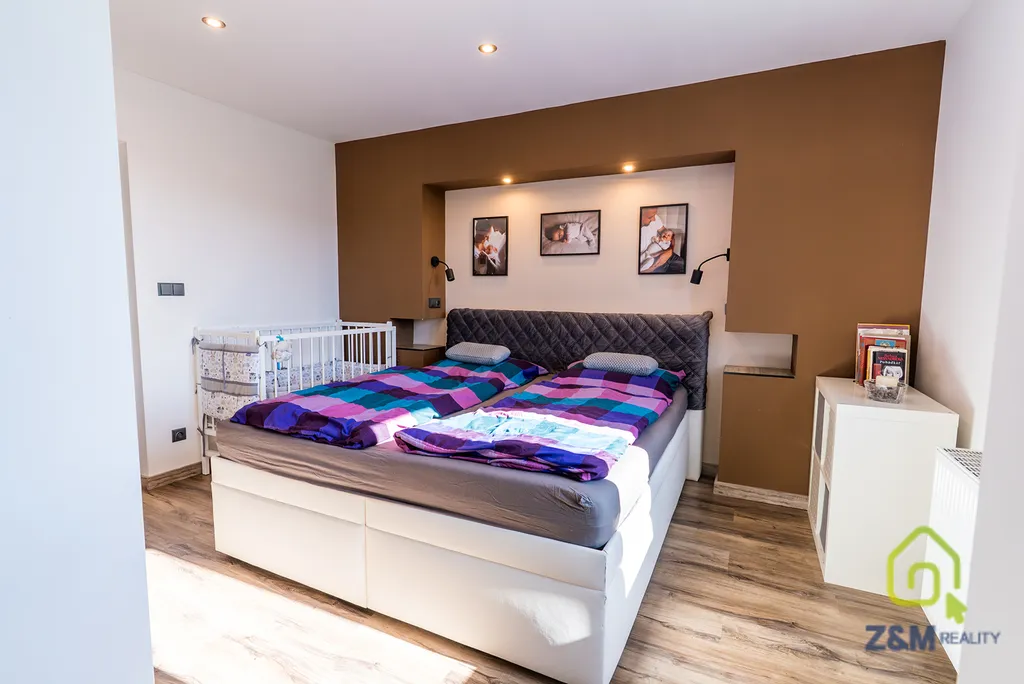 Jedná se o RD v dispozici 4kk s technickou místností a spíží, s podlahovou plochou 124m2 vytápěnou tepelným čerpadlem napojeným na klasická topná tělesa v kombinaci s podlahovým vytápěním a možností využití krbu v obýváku ,který tvoří dominantu stavby. Tepelné čerpadlo značky NIBE s výkonem 6kW s venkovní jednotkou vnitřní jednotkou pro ohřev teplé vody se 130 litrovým zásobníkem. Rozvod tepla pomocí podlahového vytápění (3 pokoje jsou vybaveny radiátory a koupelna je vybavena jak podlahovým topením, tak koupelnovým žebříkem).