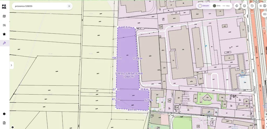 • Celková výměra: 12 065 m² (parcely č. 539/8, 539/54, 539/55).
