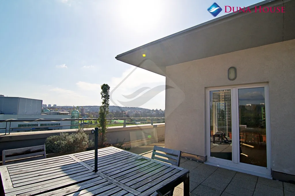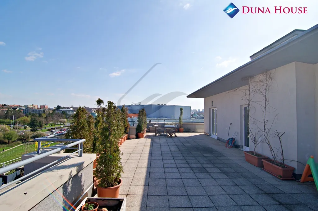 Dominantou tohoto bytu je bezesporu krásná velkorysá terasa, na kterou lze vstoupit z obou zmíněných pokojů. Je orientována na sever, východ a západ, což zajišťuje příjemné ranní slunce a dostatek světla po celý den. Díky své poloze nabízí ničím nerušený výhled do okolní zeleně, který přímo vybízí k odpočinku a načerpání energie. Díky své velikosti zde bez problému umístíte pohodlný zahradní nábytek, lehátka, gril, květiny, bylinky a mnoho dalšího. Zde se zkrátka představivosti meze nekladou. Terasa v minulosti posloužila dokonce k umístění menšího nadzemního bazénu, který v letních měsících může poskytnout vítané osvěžení.