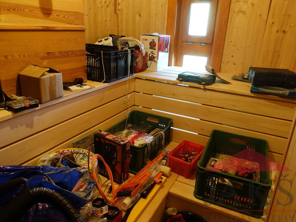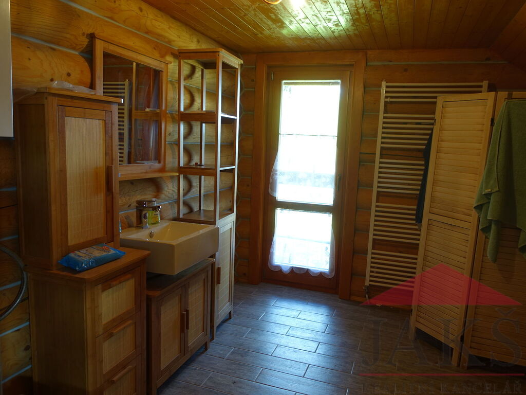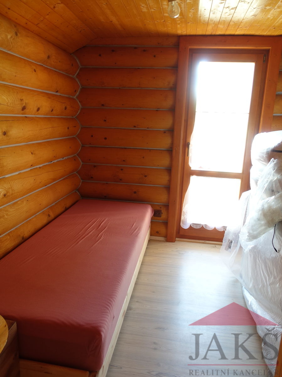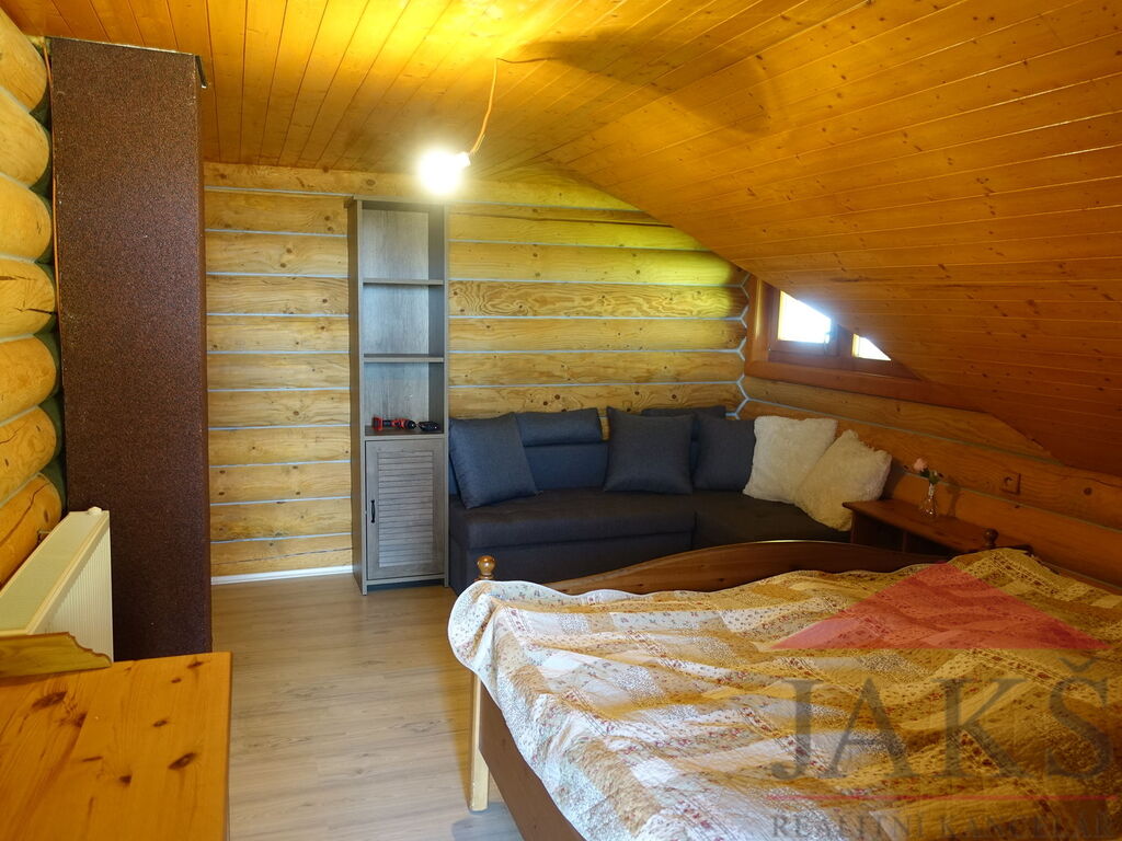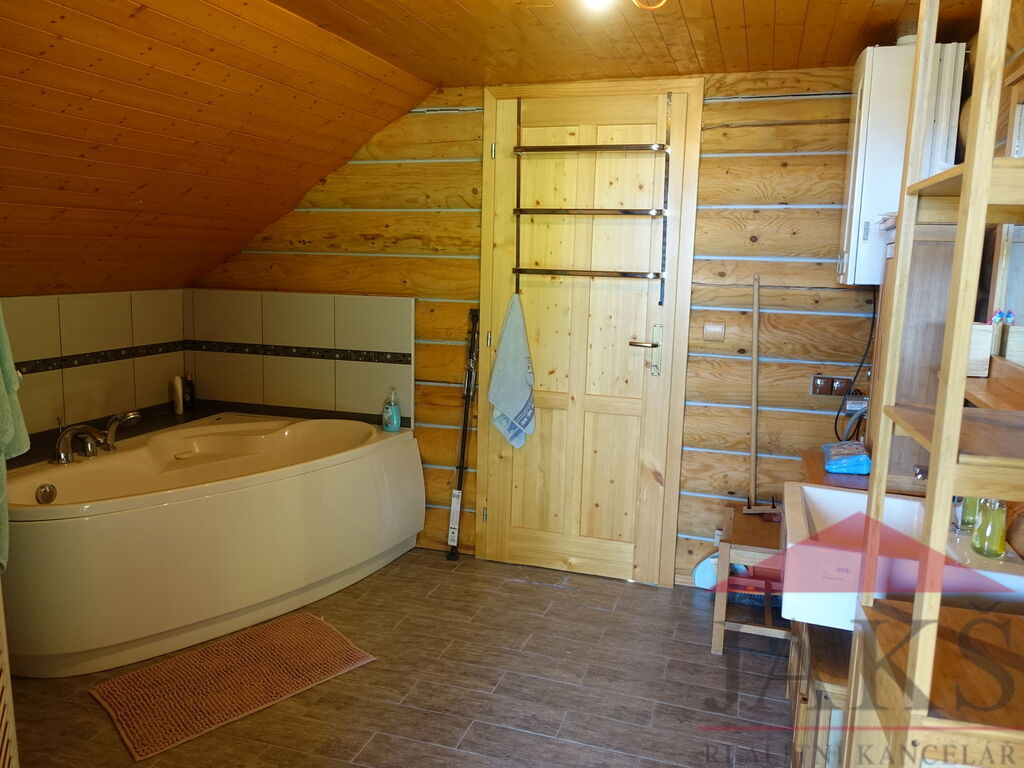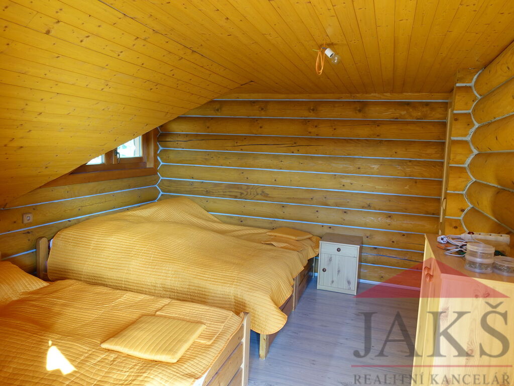 Popis: přízemí (65,4 m2): předsíň, prostorný obývací pokoj 38 m2 s kuch. koutem 9,7 m2 (kuch. linka s vest. spotř.: HV trouba, plyn. hořáky, digestoř, myčka, MV trouba, lednice), kachl. kamny, franc. dveřmi na jižní 8,7 m2 i severní terasu 15 m2 a dřev. schodištěm do podkroví, chodba, koupelna (umyv. se zrcadlem, WC, příprava pro sprch. kout) s oknem, sauna 4,8 m2 a místnost 5,3 m2 s bazénem; podkroví (47,1 m2): hala 6 m2, hlavní koupelna 7,9 m2 (umyv. se zrcadlem, rohová vana, paraván, WC, topný žebřík, plynový kotel) s franc. oknem na terasu 14 m2, hlavní ložnice 13,2 m2 s fr. oknem na terasu; 2x ložnice 14 m2 a 6 m2 s fr. okny na jižní terasu 8 m2 s otevřeným výhledem do krajiny.