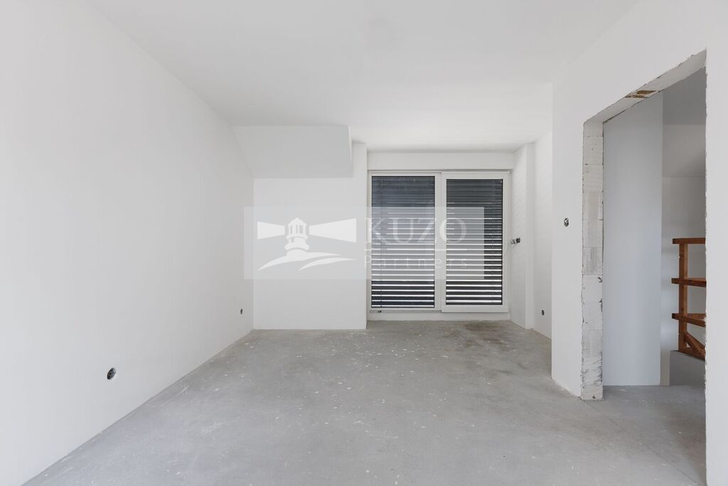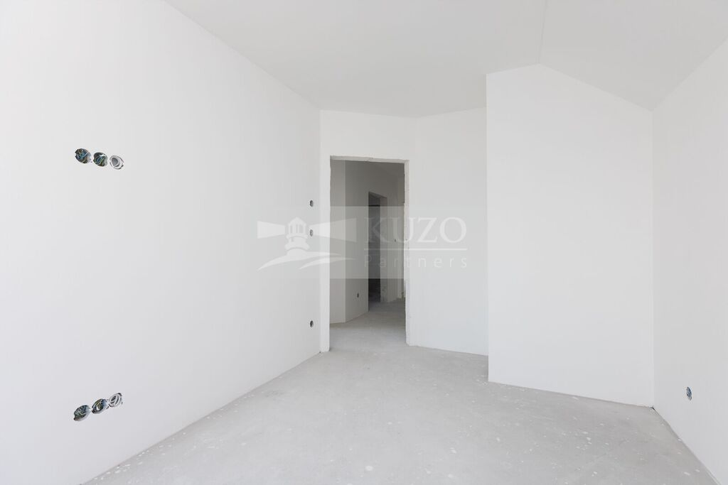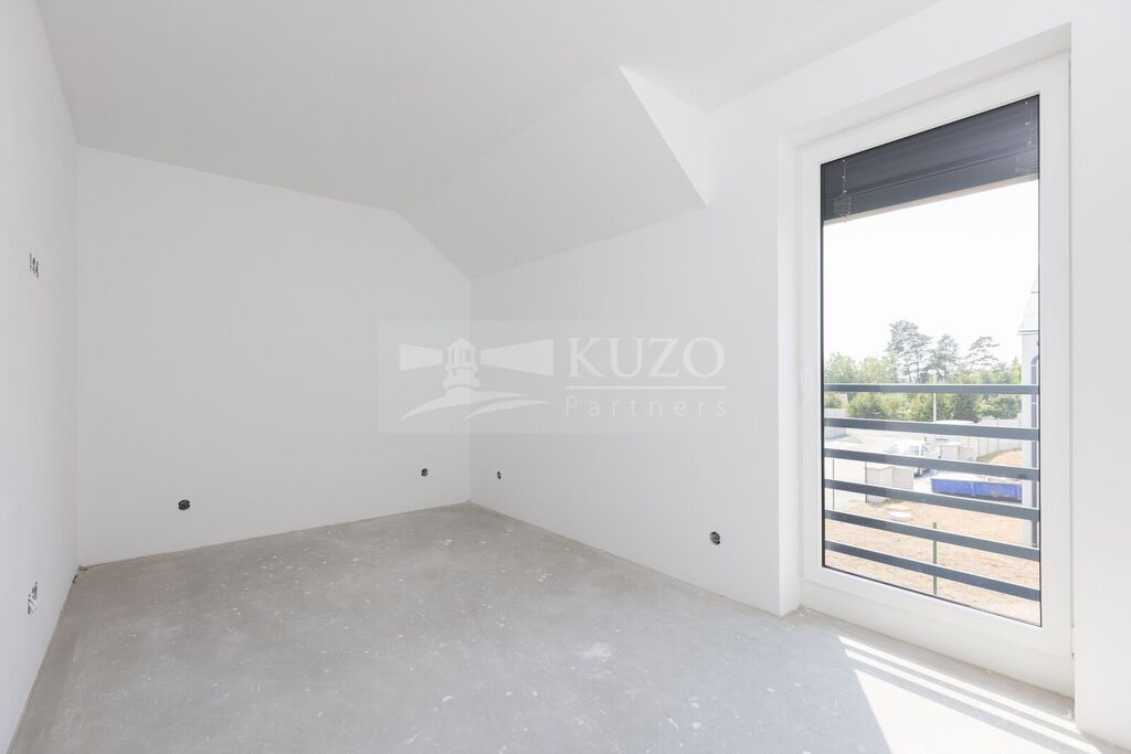 Podlahy v přízemí pokrývá praktická dlažba. V patře je podlaha z vinylové krytiny v barvě světlého dubu, která je odolná a snadná na údržbu. Interiérové dveře a obložky jsou provedeny v bílé barvě, což podtrhuje čistý a moderní vzhled interiéru. Kuchyň je vybavená kuchyňskou linkou s vestavnými spotřebiči.
