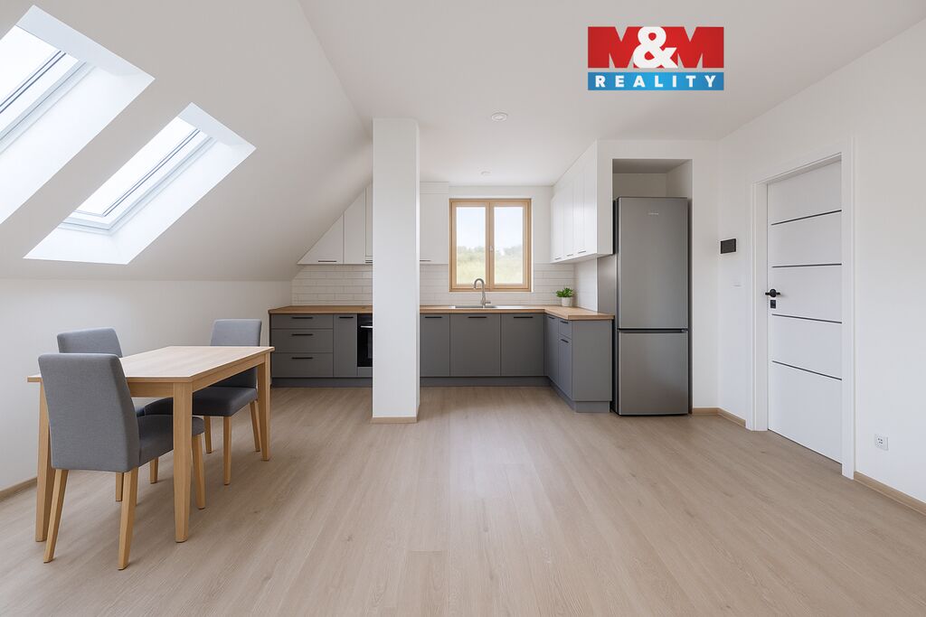 POSLEDNÍ BYT v tomto domu na prodej! Nový, nadstandardní byt 2+kk v Řevničově o ploše 77 m² ve 2. patře domu z roku 2023. Skládá se z neprůchozí ložnice, předsíně, designově zpracované koupelny a prostorného obývacího pokoje s přípravou na kuchyňskou linku. Z bytu je vlastní přístup na půdu, kterou lze využít jako odkládací prostor. Vytápění celého bytu je řešeno elektrickým podlahovým topením. Náleží k němu parkovací stání na uzavřeném dvoře a společné sklepní prostory. V obci naleznete základní i mateřskou školu, prodejnu COOP, restaurace i zastávku autobusu a to v pěší dostupnosti od domu. Perfektní dostupnost do Prahy zajišťuje blízký nájezd na dálnici D6.