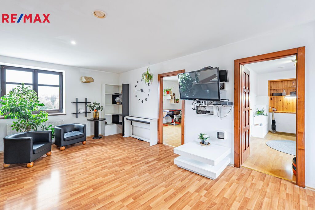 V domě se nachází dvě kuchyně, obývací pokoj, čtyři samostatné pokoje v patře včetně šatny a malé spíže u horní kuchyně. V přízemí je jeden velký pokoj (aktuálně kadeřnictví) a přes chodbu další samostatný pokoj (bývalé kadeřnictví). Součástí domu je také zastřešená veranda (balkon), dvě koupelny (jedna v přízemí s oddělenou šatnou), pět toalet, garáž, malý sklep ve starší části domu s tlakovou nádobou na studnu, skladový prostor vedle garáže na zahradní nábytek a podzemní kamenný sklep s klenutými stropy ideální pro uskladnění zeleniny. Dispozice tedy umožňuje pohodlné vícegenerační soužití i oddělené provozy, případně kombinaci bydlení a podnikání.