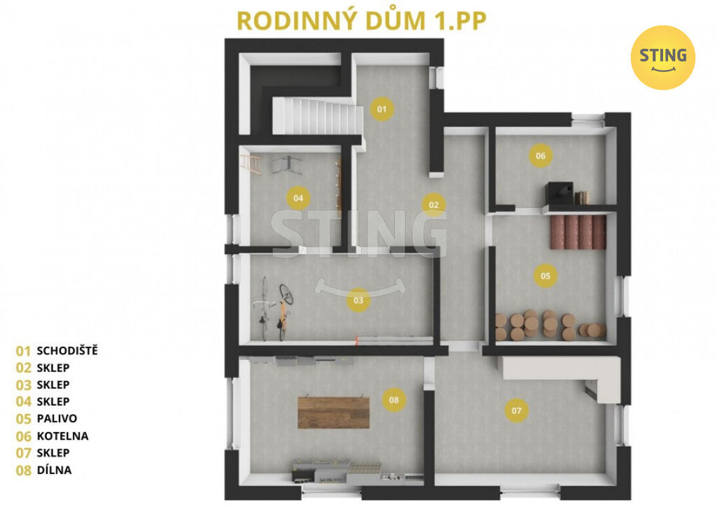 Dům je celý podsklepený, s garáží, dílnou a dalšími úložnými prostory.