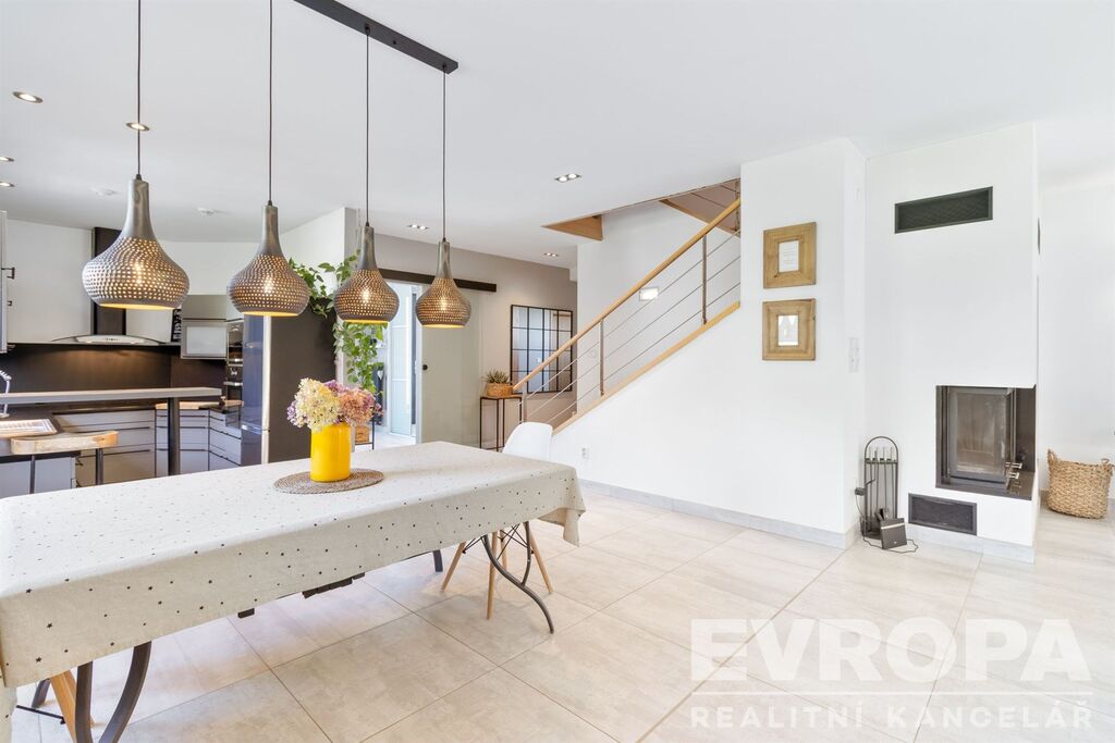 V přízemí se nachází vzdušný obytný prostor propojený s kuchyní a jídelnou, s přímým vstupem na zahradu s terasou. Ta je vybavena bioklimatickou pergolou, vířivkou, grilovacím koutem a venkovním betonovým stolem. Dále je zde samostatný pokoj, koupelna s WC a prostorné zádveří. Vstup do domu vede přes jižní terasu s krásným výhledem do okolí.