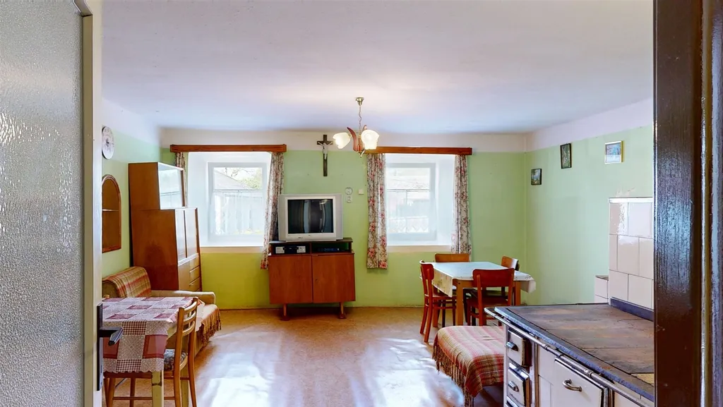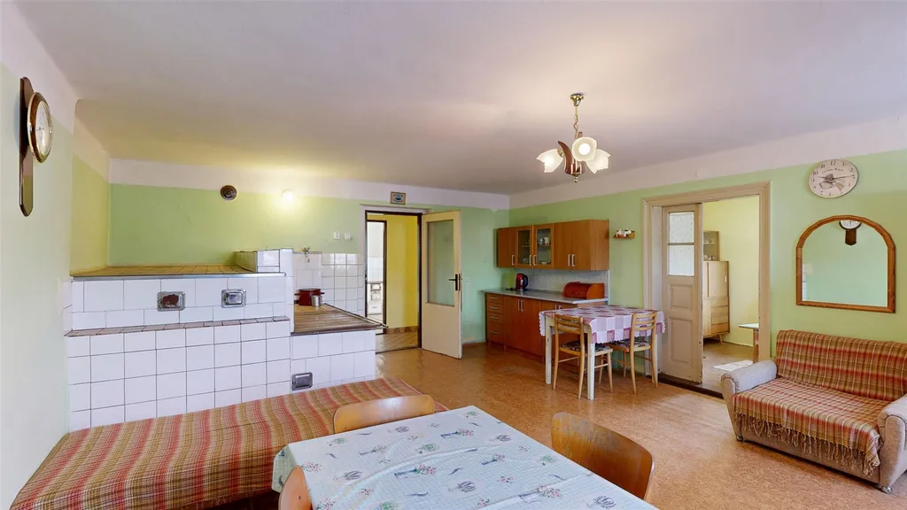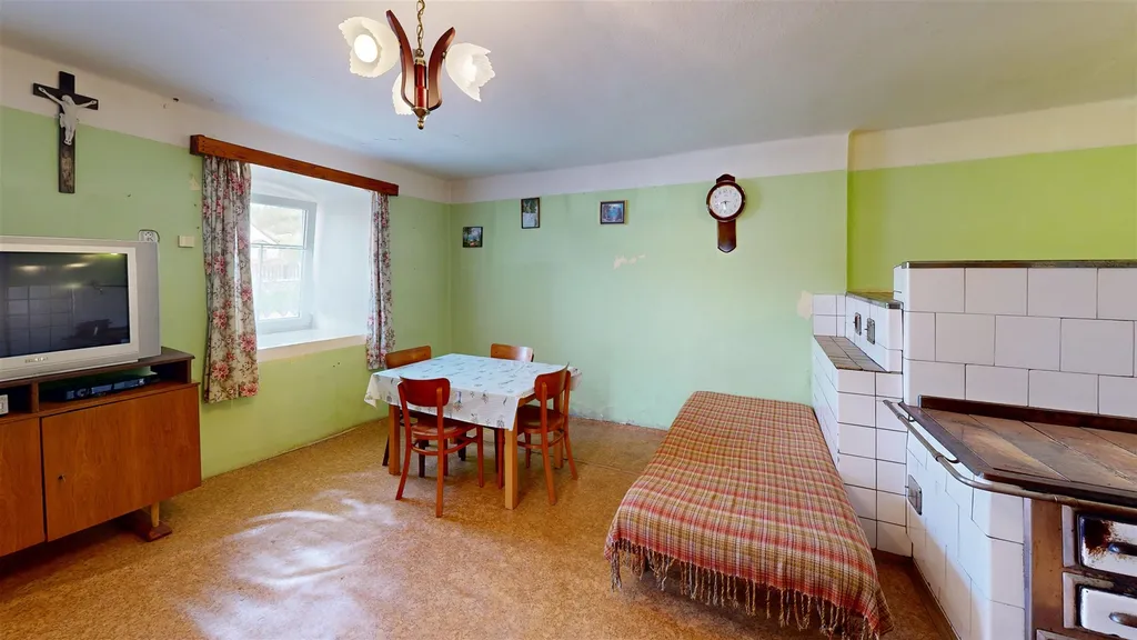 Rodinný dům je v obyvatelném stavu, má nová plastová okna, lokální topidla na tuhá paliva, je částečně podsklepený a nabízí možnost rozšíření obytného prostoru do podkroví.