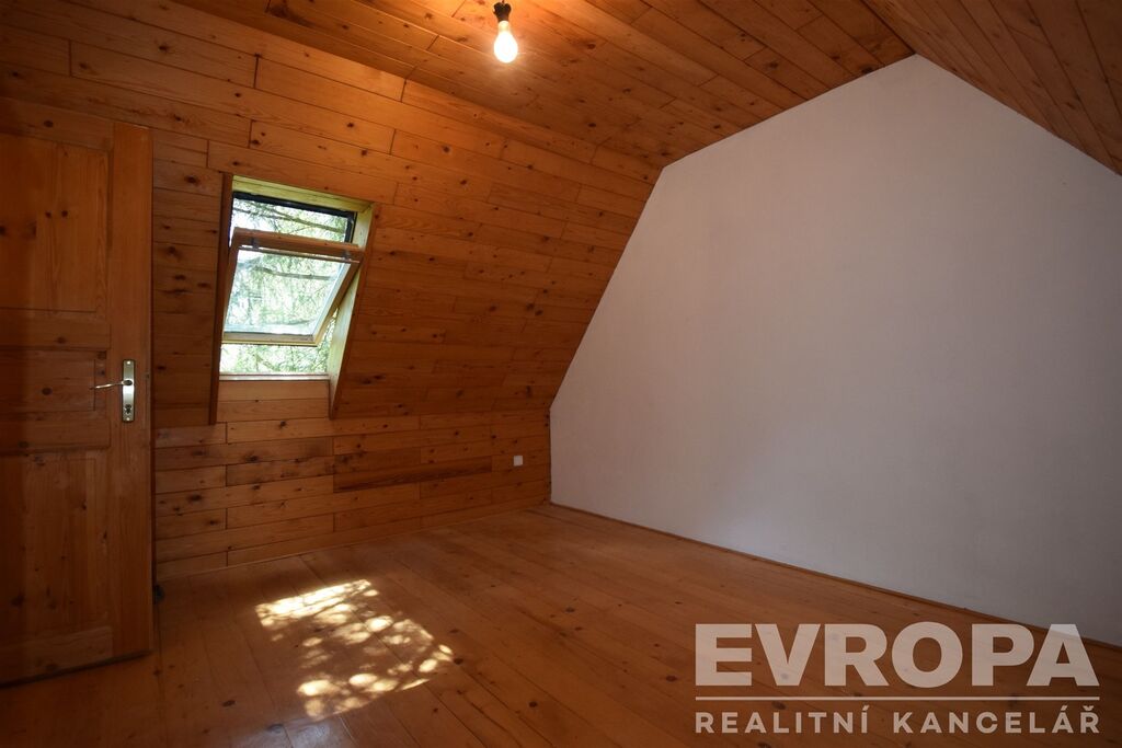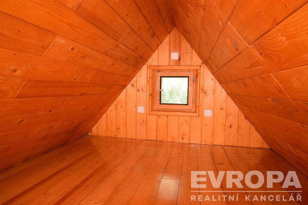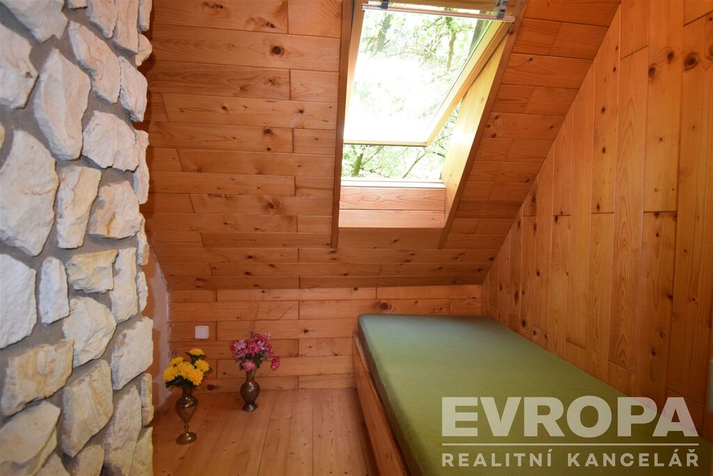 Chatová osada byla založena v šedesátých letech minulého století. Nabízená chata byla postavena v roce 1958, v roce 2001 prošla rozsáhlou rekonstrukcí spolu se zvětšením zastavěné plochy z původních 36 m2 na současných 58 m2 a vybudováním obyvatelného podkroví. Nyní má chata užitnou plochu 89 m2. V částečně zapuštěném přízemí je sklep, který slouží jako dílna, úložistě zahradního nábytku a nářadí. Ve sklepě je instalován bojler pro ohřev TUV. Ve zvýšeném přízemí je terasa, velká společenská místnost s krbem, koupelna se sprchovým koutem a WC, chodba s kuchyňským koutem a schodištěm do podkroví. V podkroví nalezneme tři ložnice a také útulný prostor pro odpočinek s knihou v ruce. Chata má vlastní vrtanou studnu, odpadní vody jsou svedeny do septiku.