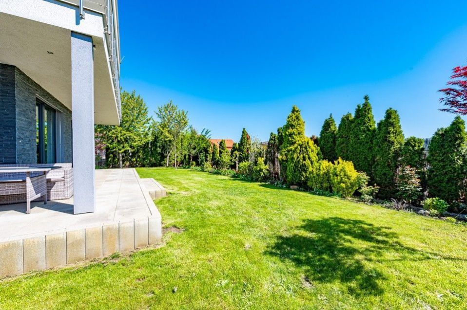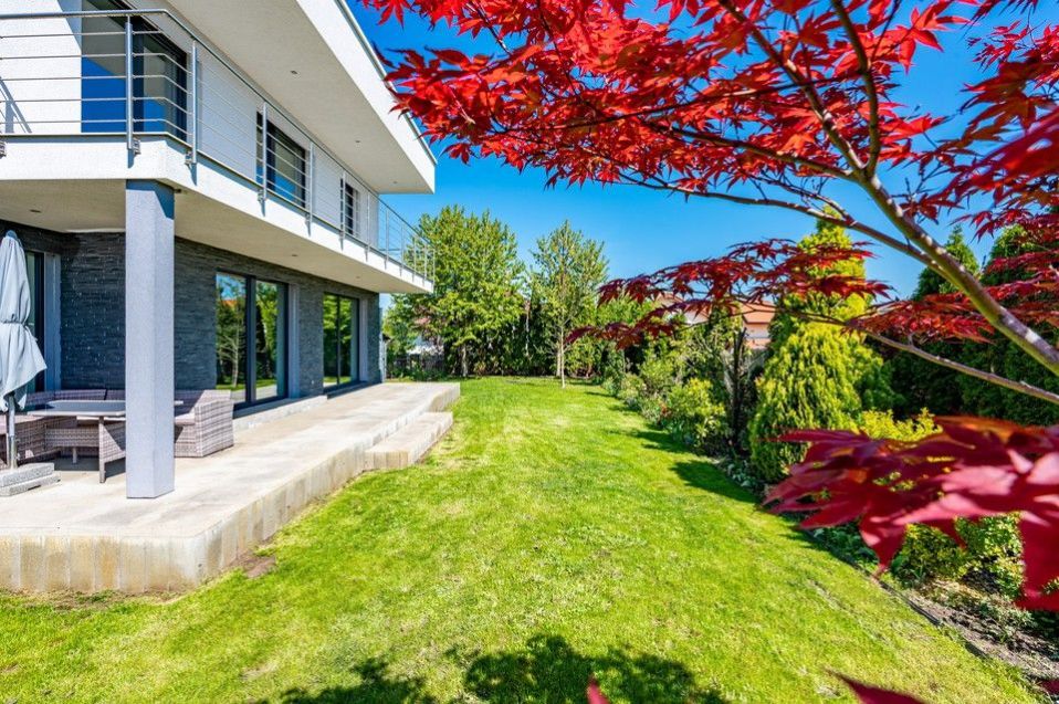 V krásné udržované zahradě jsou vzrostlé stromy, keře a záhony. Automatický zavlažovací systém Hunter čerpá vodu z vlastní studny. Další stavbou na pozemku je zahradní domek na nářadí a zahradní krb. Na východní terase v přízemí domu, orientované do hlavní části zahrady, je venkovní posezení.