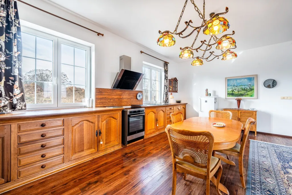 Veškeré dřevěné konstrukce a prvky, všechny stupně schodiště, interiérové dveře a kuchyňská linka jsou vyrobeny výhradně z přírodního masivního modřínu, dubu, buku nebo smrku ve střešních trámech.