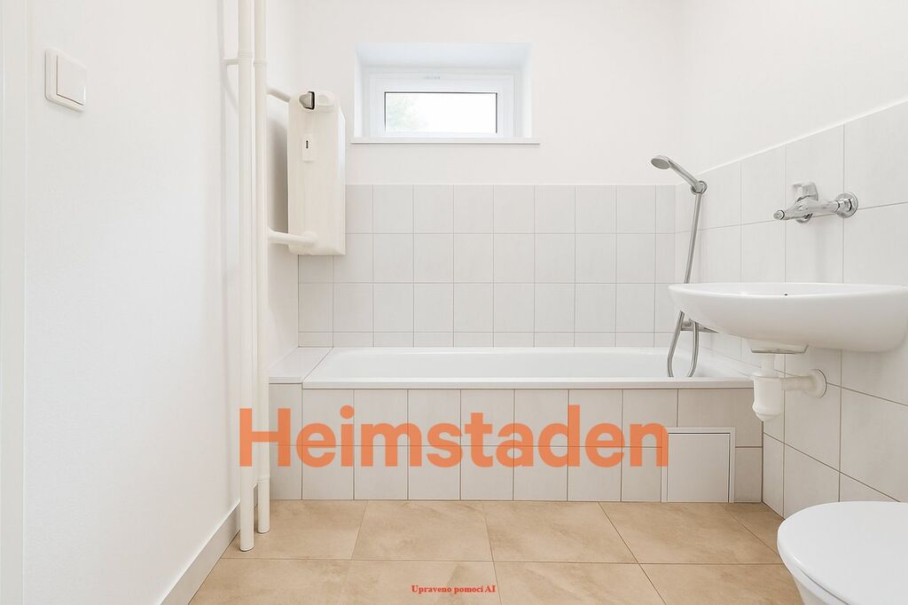 Koupelnu s vanou, WC a oknem pro přirozené větrání.
