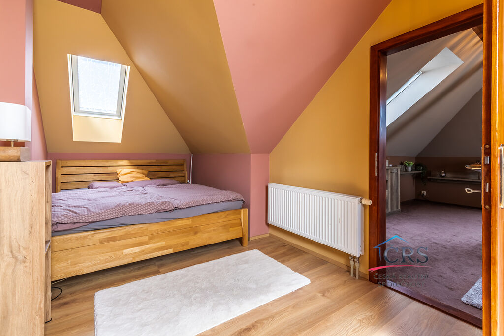 Dvougenerační rodinný dům o celkové dispozici 8+1 ležící na pozemku o velikosti 840 m2, zastřešenou terasou 30 m2 bazénem a prostornou garáží. V přízemí se nachází prostorný obývací pokoj s východem na terasu, pracovna, koupelna, samostatná toaleta, garáž, chodba, zádveří, kuchyňská linka s vestavěnými spotřebiči ( sklokeramická deska, el. trouba, myčka, mikrovlnná trouba, digestoř, americká lednice ). V prvním patře jsou 3 ložnice, obývací pokoj, ložnice ( zde je příprava na kuchyňskou linku ), chodba, pracovna, koupelna s toaletou. Dům napojen na veškeré IS ( vodovod, plyn, elektřina, kanalizace, vlastní studna ), vytápění v domě řešeno plynový kotlem – v přízemí podlahové, v patře radiátory. Dům byl zkolaudován v roce 2008.