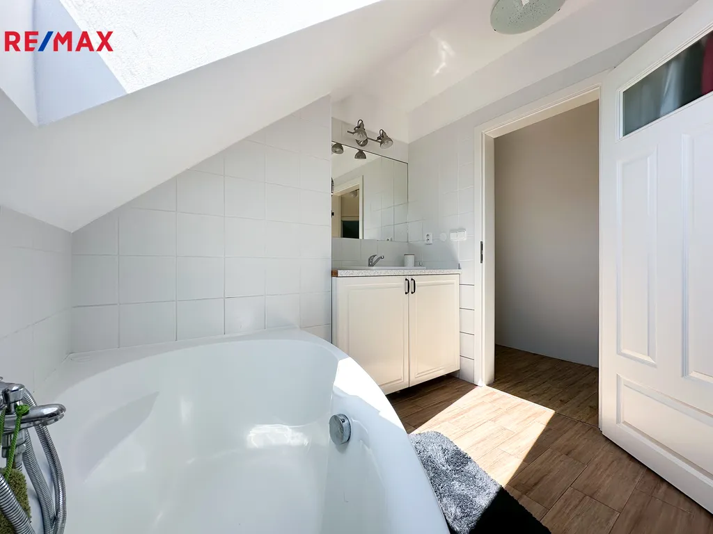 V patře domu se nachází hlavní ložnice se samostatnou šatnou, tři další ložnice a koupelna s toaletou. Součástí domu je také garáž pro jeden automobil.