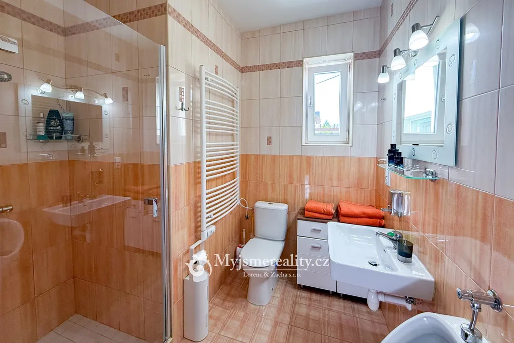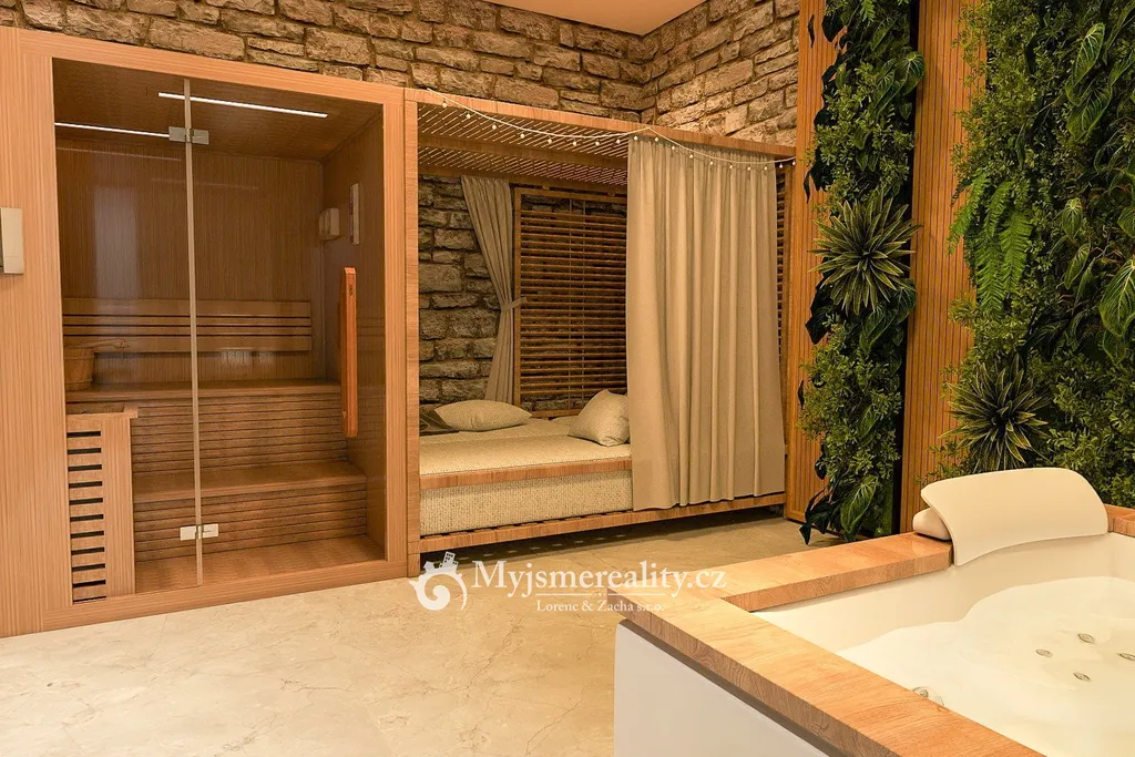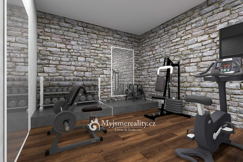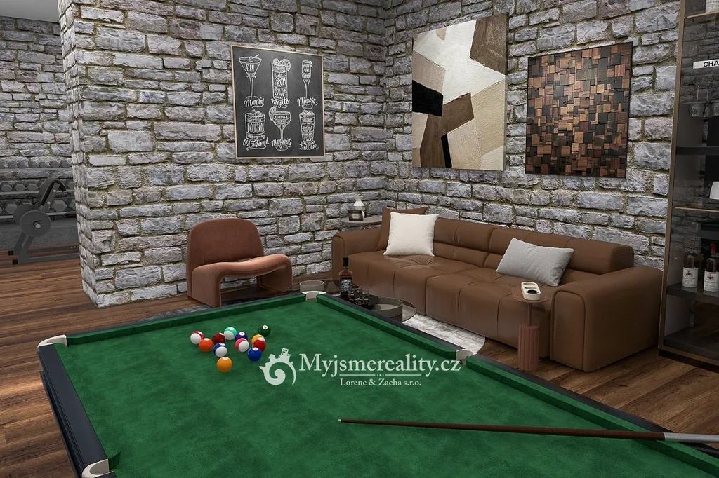 V patře vás přivítá klidová část s třemi komfortními ložnicemi, elegantní koupelnou s vanou i sprchovým koutem a samostatnou šatnou. Suterén nabízí rozmanité možnosti využití – od wellness centra přes domácí fitness, vinný sklípek až po soukromý klub nebo ateliér.