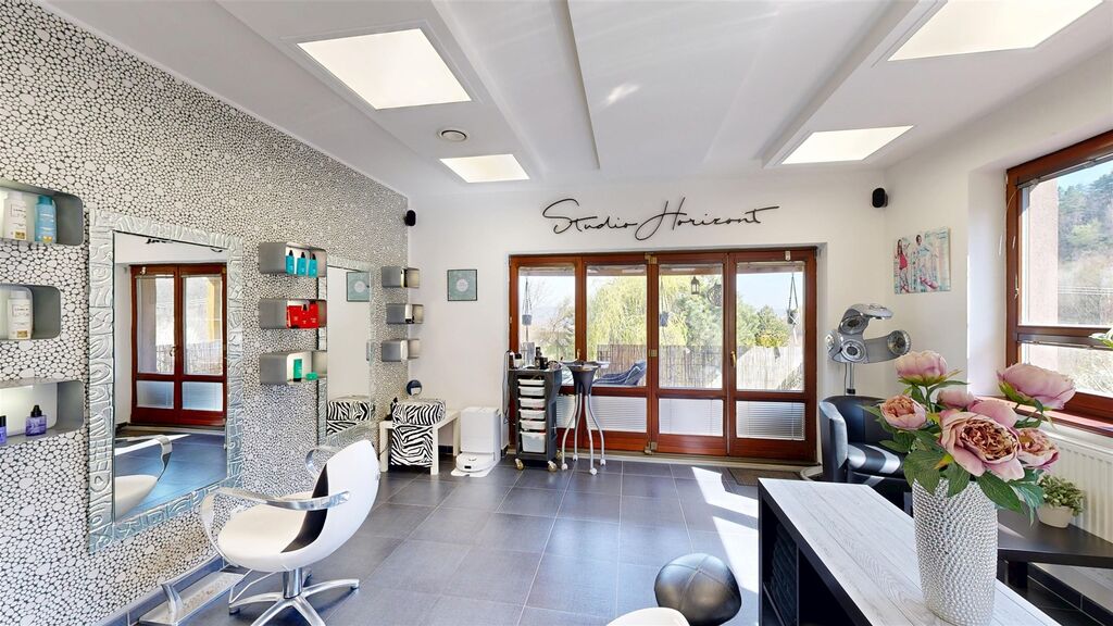 NP: obývací pokoj, kuchyně s jídelnou, pracovna, koupelna, kadeřnictví, garáž, komora