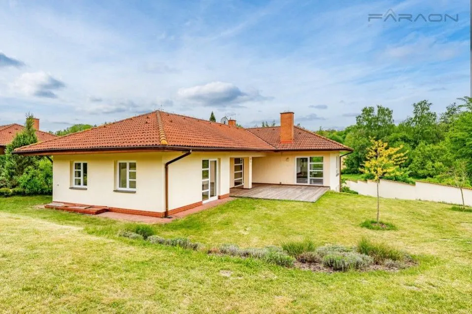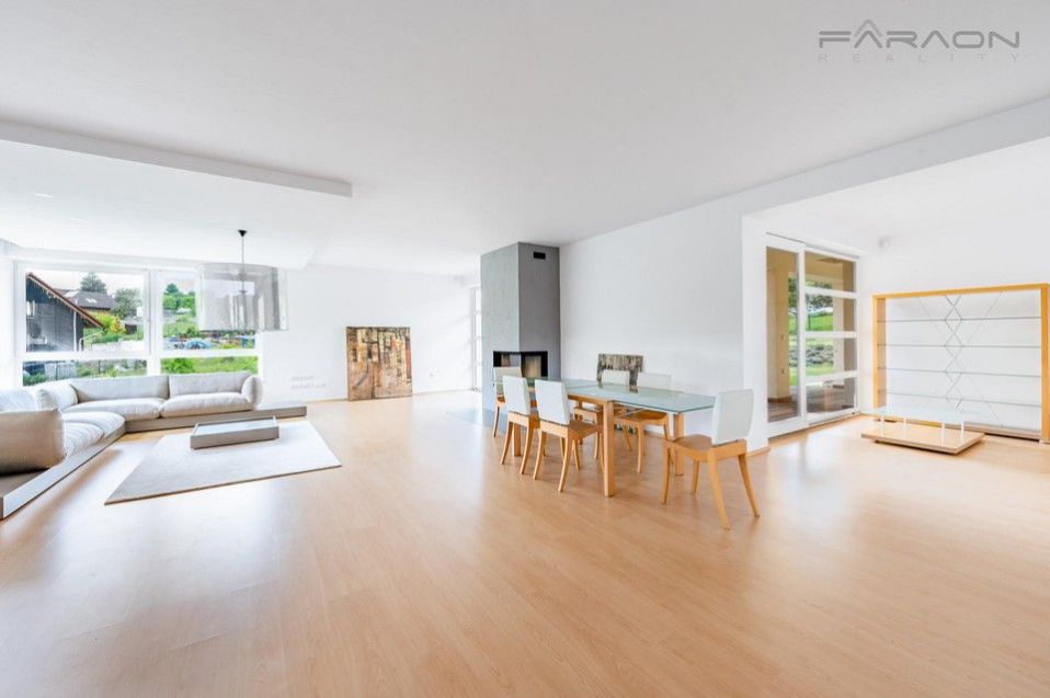 Jednou V přízemí se nachází prostorný obývací pokoj s krbem a přímým vstupem na terasu a zahradu, dále plně vybavená kuchyň s jídelní částí, tři ložnice, koupelna s vanou, sprchovým koutem, bidetem a toaletou, a prostorná vstupní hala s úložnými prostory. V suterénu je další pokoj využitelný jako ložnice pro hosty nebo pracovna rovněž s přímým vstupem na zahradu druhá koupelna, technická místnost, prádelna, komora a skladovací prostor. Součástí domu je také garáž pro dva automobily a jedno další parkovací stání před domem.