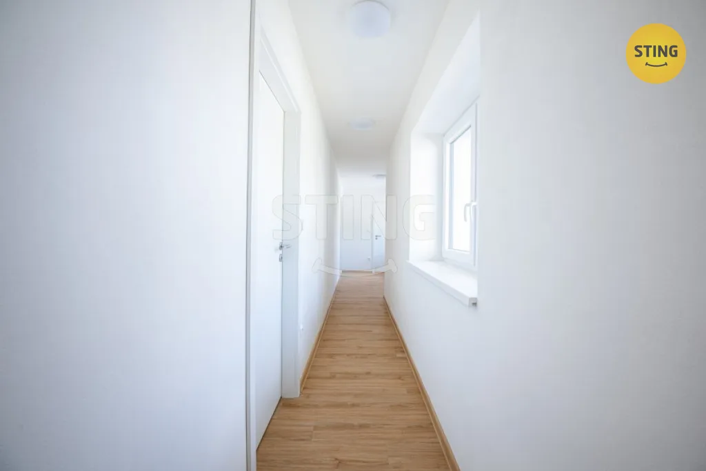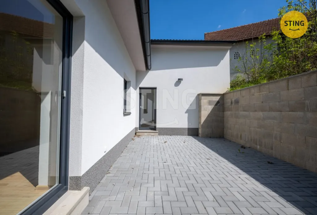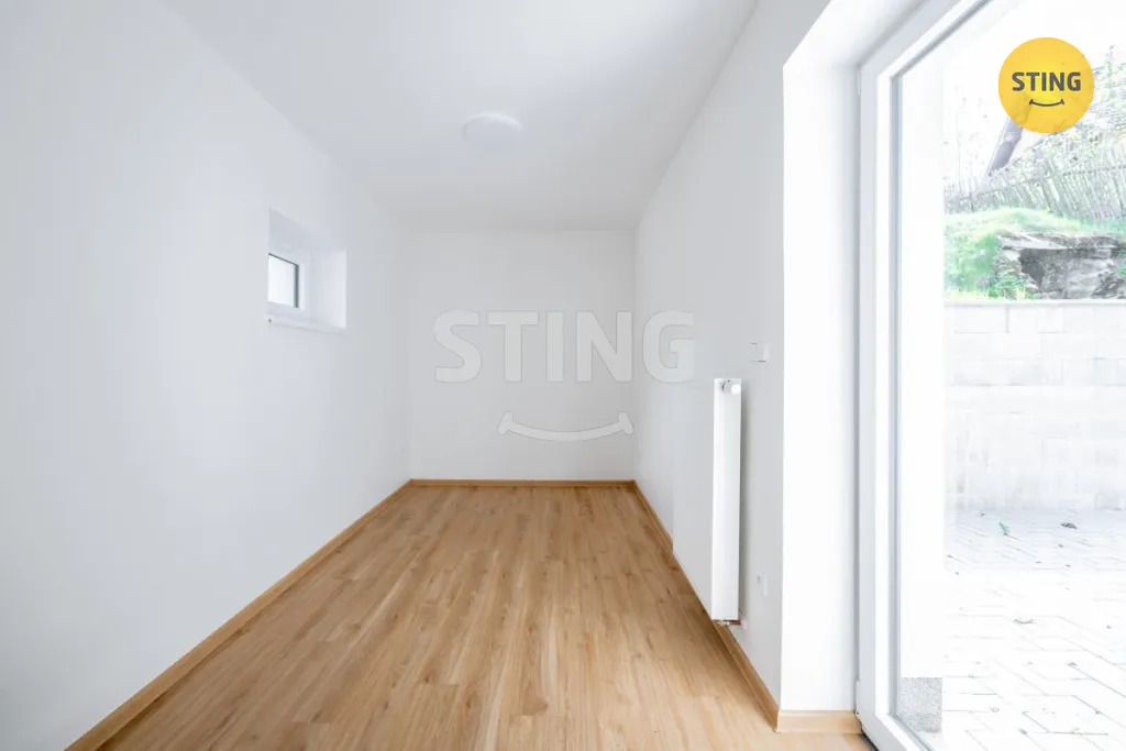 V přízemí najdete světlý obývací prostor propojený s kuchyňským koutem ve zvýšené části. Z kuchyně vede přímý vstup na zahradu. Dále jsou zde tři ložnice – dvě z nich mají výstup na terasu. Nechybí koupelna, chodba s denním světlem a praktická předsíň. Parkovat lze pohodlně přímo na pozemku. Součástí pozemku je i sklepní prostor ve svahu.
