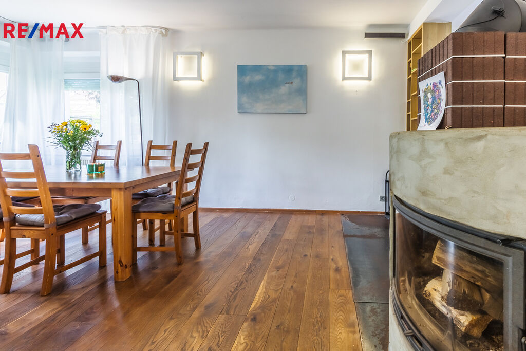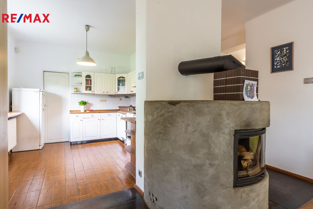 ✓ Velkorysý obývací prostor s atypickým krbem a kuchyňským koutem a spíží (70 m²).