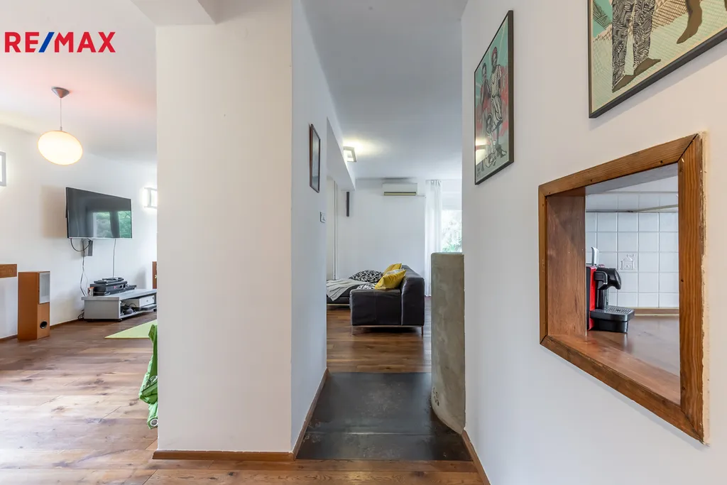 ✓ Prostorný obývací pokoj s atypickým krbem, kuchyňským koutem a spíží (celkem 70 m²)