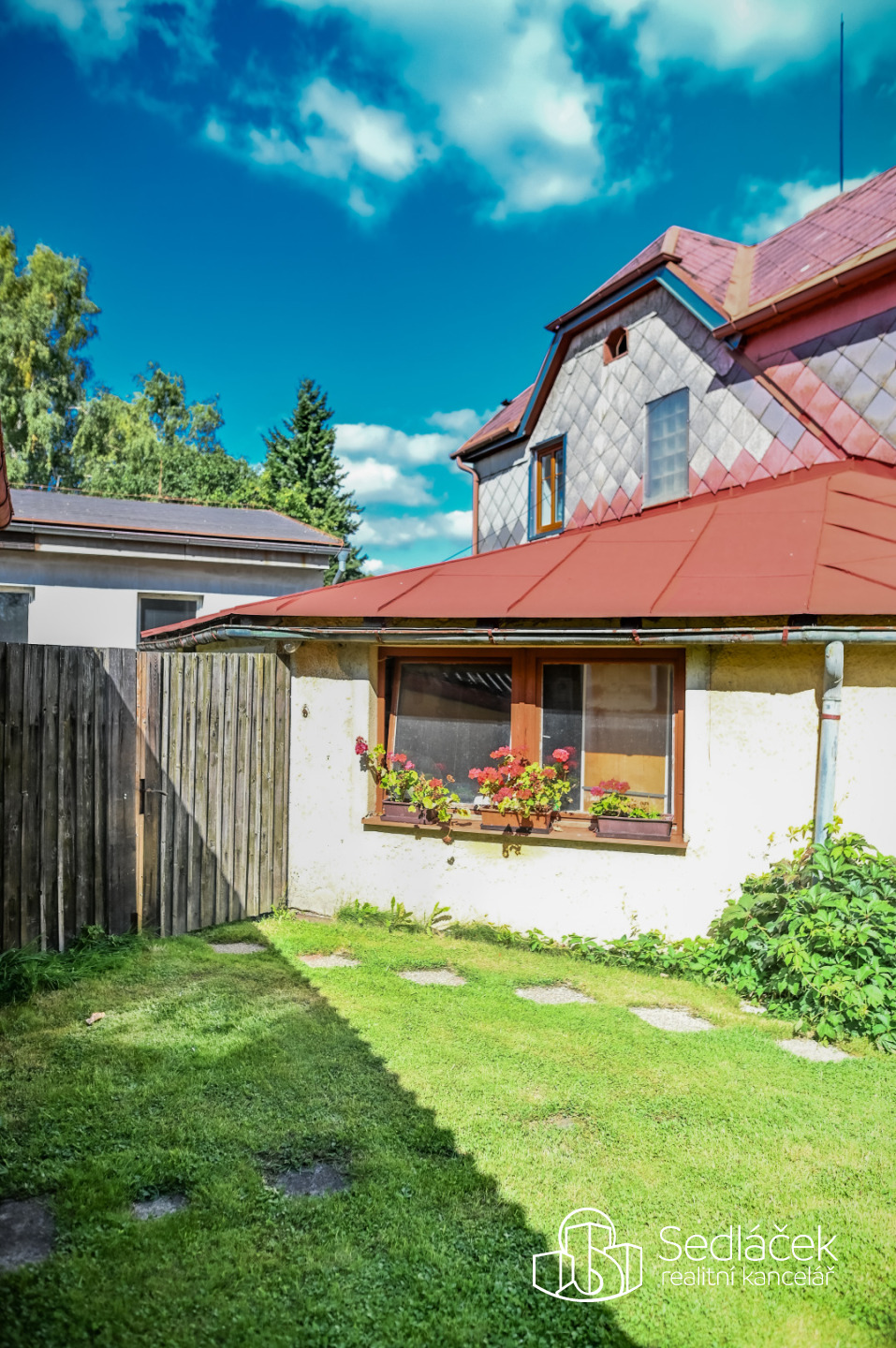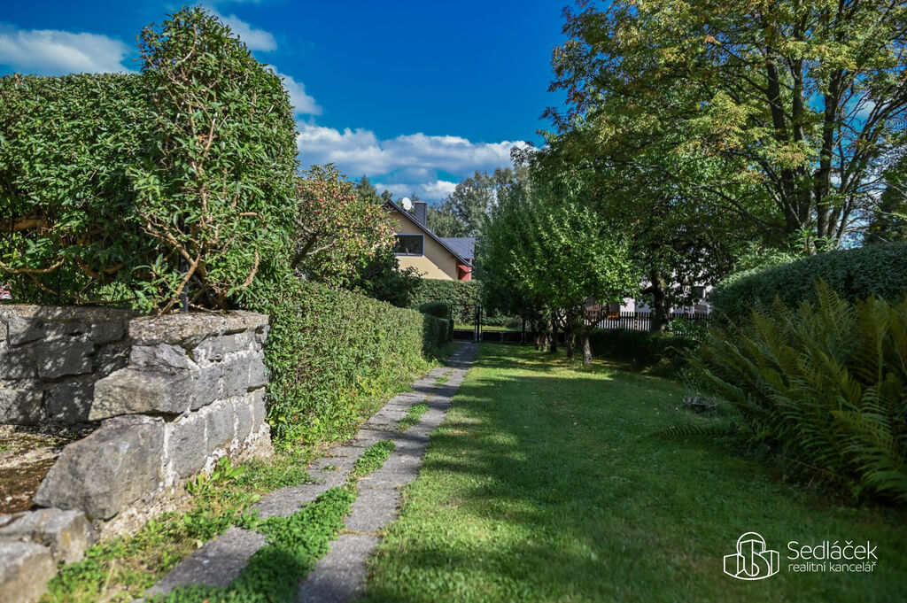Dům stojí na slunném pozemku o velikosti 1 022 m² se vzrostlými stromy, keři a příjemným koutem pro posezení.