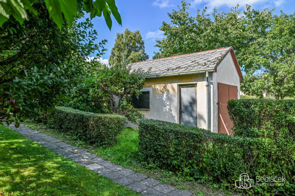 Za domem je zahrada ideální pro pěstování zeleniny nebo chov drobných zvířat – současný majitel zde chová slepice.