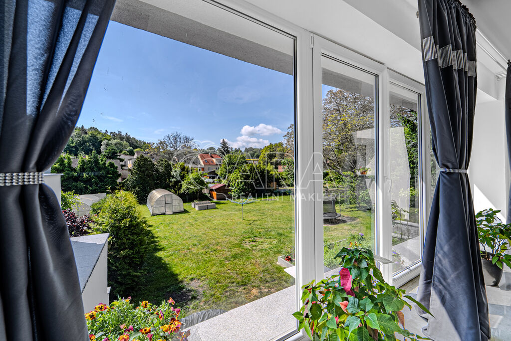 • Přístavba jídelny s francouzskými okny nad terasou s výhledem do zahrady. Z jídelny vede venkovní schodiště přímo na zahradu.