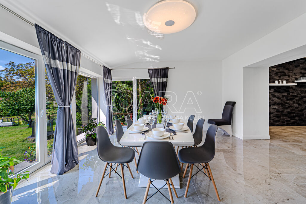 Přízemí: Ze zádveří vedou schody do suterénu a do zvýšeného přízemí. Zde se nachází prostorný obývací pokoj propojený s moderní kuchyní, velká prosluněná jídelna s nádherným a klidným výhledem do zahrady a na přilehlý les, ložnice s komorou a s přímým vstupem do koupelny vybavené sprchovým koutem, vanou a toaletou, a dále samostatná toaleta.