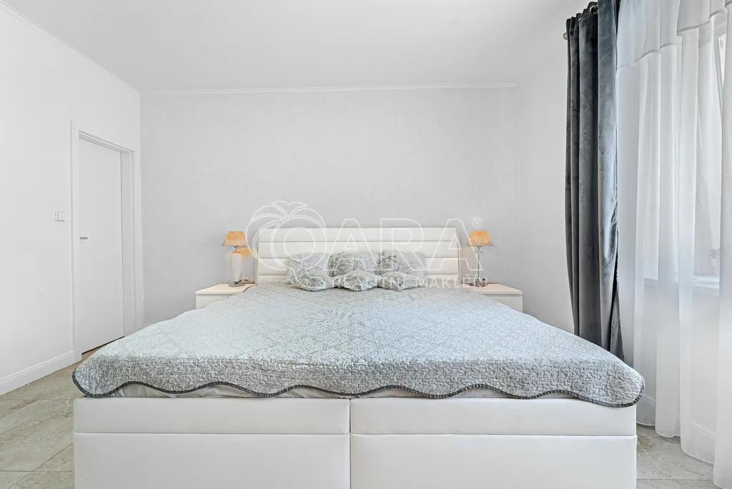 Přízemí: Ze zádveří vedou schody do suterénu a do zvýšeného přízemí. Zde se nachází prostorný obývací pokoj propojený s moderní kuchyní, velká prosluněná jídelna s nádherným a klidným výhledem do zahrady a na přilehlý les, ložnice s komorou a s přímým vstupem do koupelny vybavené sprchovým koutem a vanou, a dále samostatná toaleta.