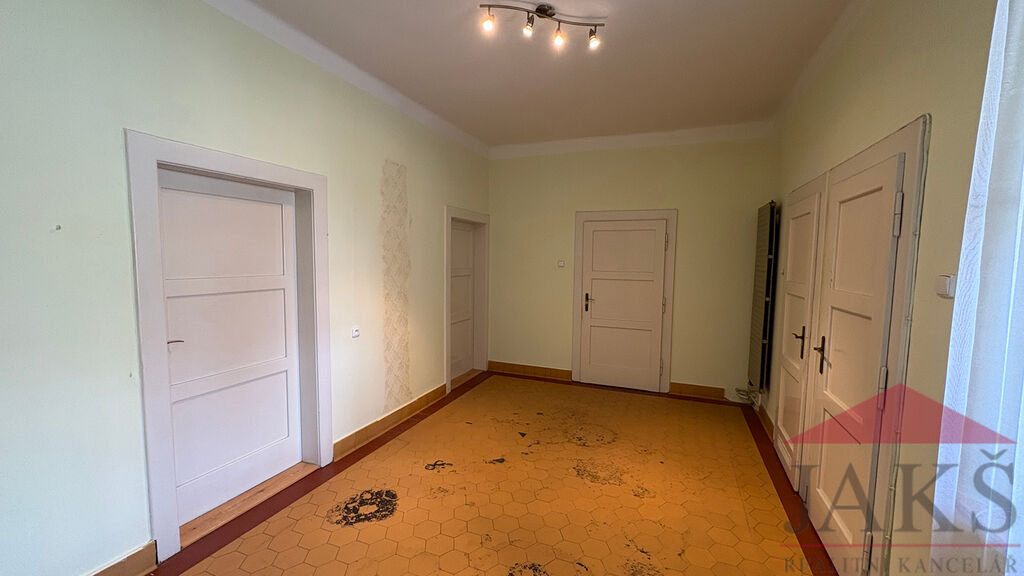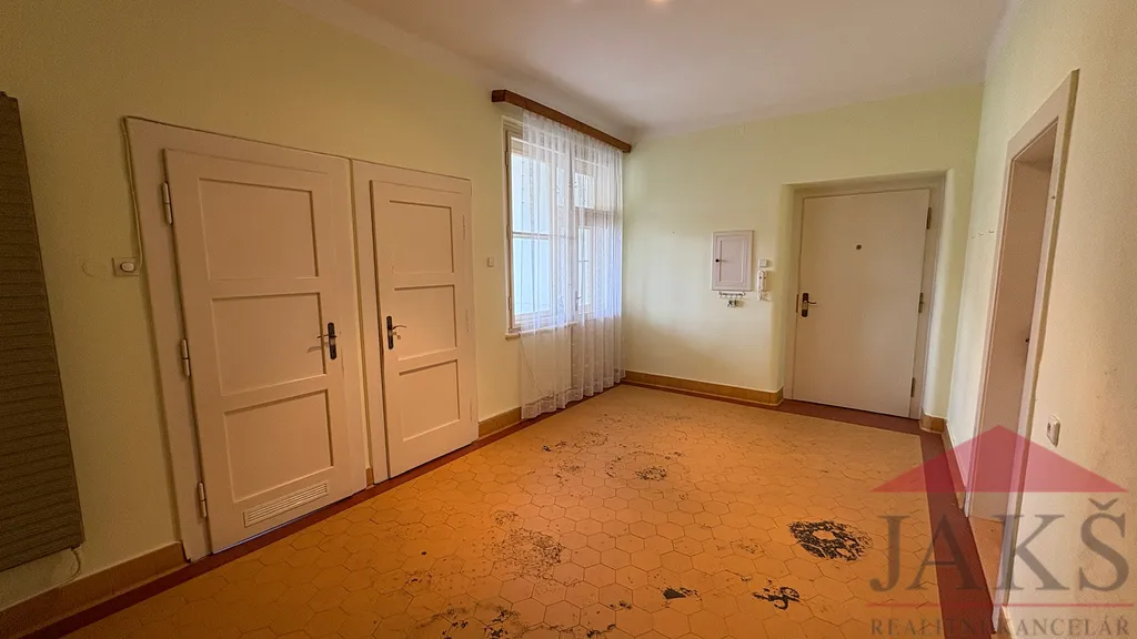 Popis: předsíň 17,55 m2, samostatné WC 2,31 m2, koupelna 5,13 m2 (vana, umyv. se zrcadlem, vývody na pračku, plynový kotel), bývalý balkon, nyní pracovna 5,33 m2 (šlo by obnovit po vybourání zdi anebo rozšířit do velké předsíně a přestavět na pokoj), kuchyň 17,58 m2 (kuch. linka s plynovým sporákem s el. troubou) s jídelnou, spíž 2,54 m2, komora 4,67 m2, prostorný obývací pokoj 29,97 m2 a 2x ložnice 23,31 m2 a 20,14 m2.