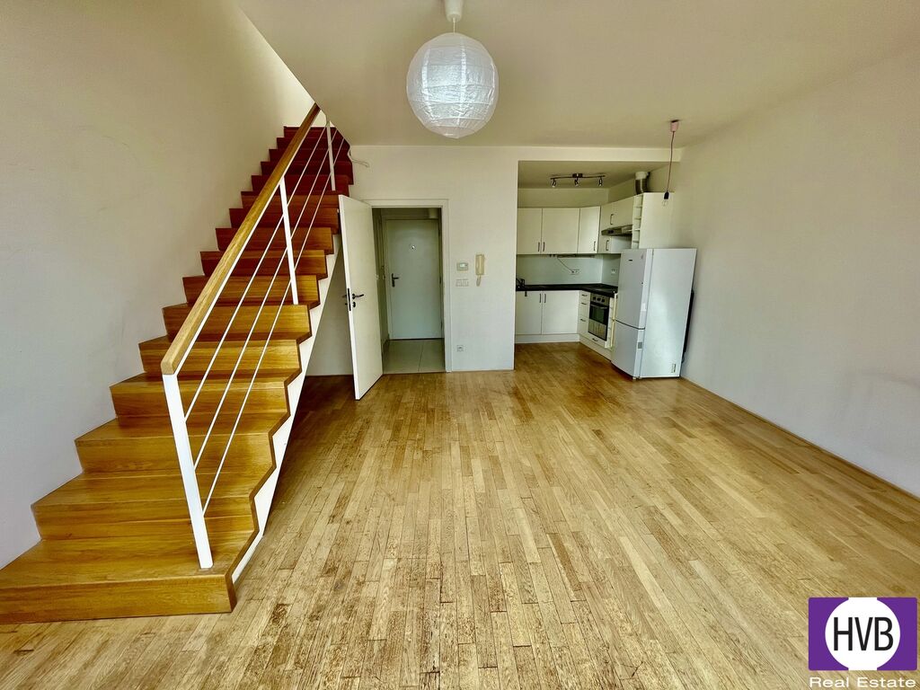 Jednotka orientována východním a severozápadním směrem prošla kompletní, nákladnou rekonstrukcí, včetně instalované klimatizace. Dispozice - vstupní chodba, obývací pokoj volně navazuje na plně vybavený kuchyňský kout, samostatná toaleta. Po dřevěném schodišti se dostaneme do vrchního patra, kde nalezneme velkou obytnou místnost s krásným výhledem do vnitrobloku, koupelnu s vanou a WC.