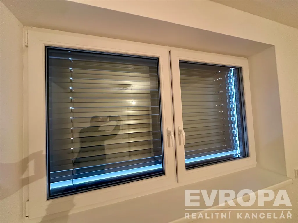 Velká okna s venkovními žaluziemi pro regulaci světla a teploty.