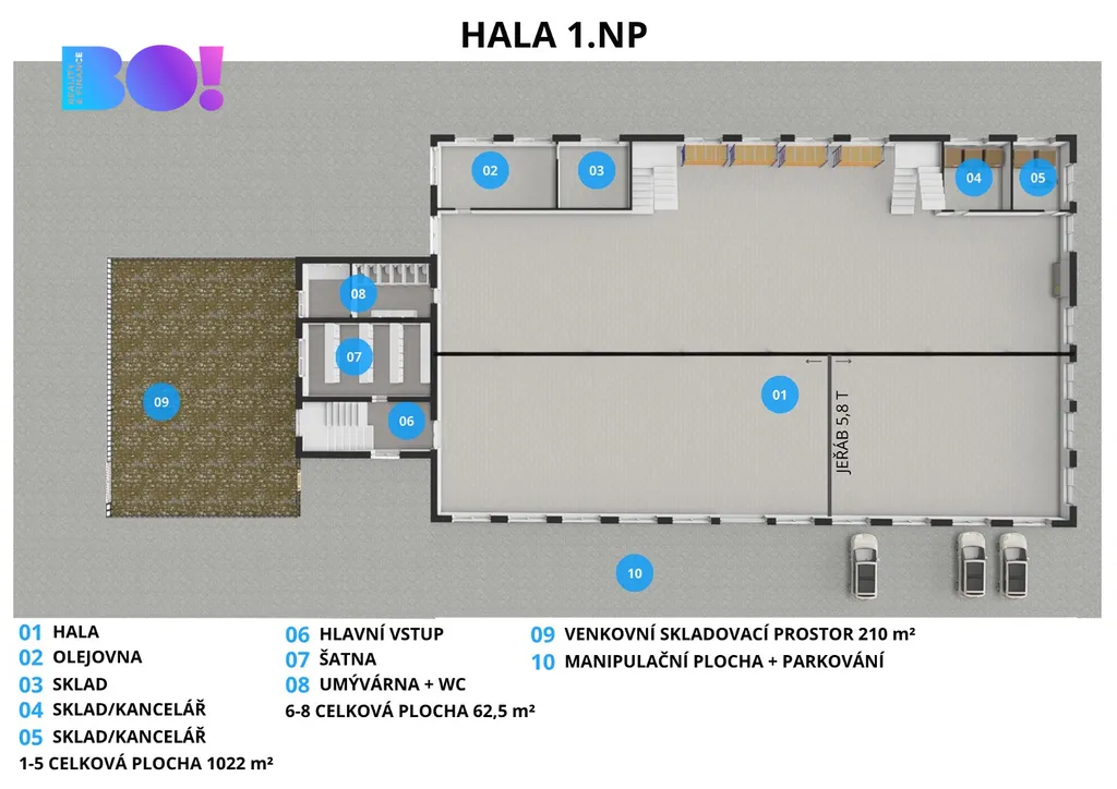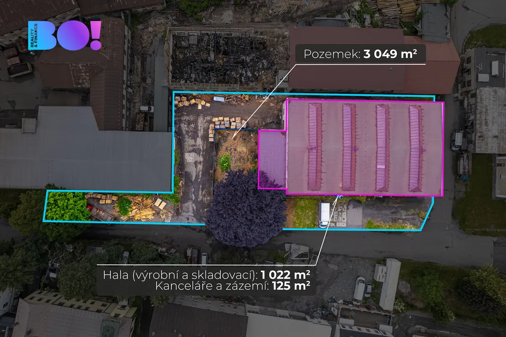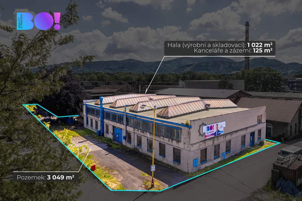 Hledáte místo, kde vaše podnikání poroste a vaše vize dostanou pevné základy? BO! Reality vám s radostí nabízí ke koupi prostornou výrobní halu se skladovacími prostory, kancelářemi a kompletním zázemím pro váš tým. Celková užitná plocha 1 147 m² na pozemku o rozloze 3 049 m² vám dává svobodu tvořit, rozvíjet a růst.