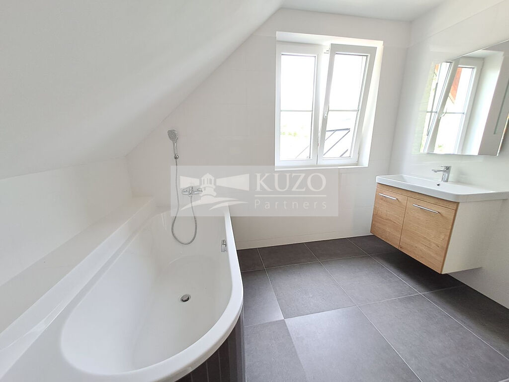 V podkroví je klidová zóna se třemi samostatnými pokoji, které nabízejí výhledy na okolní krajinu a hory. Hlavní koupelna s vanou je navržena jako místo pro vaši relaxaci. Při výstavbě byl kladen důraz na detail a kvalitní, nadčasové barvy a materiály – od velkoformátových obkladů v přírodních tónech až po poctivé řemeslné zpracování.