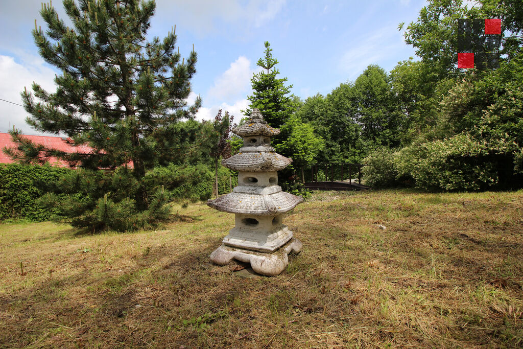 Pozemky jsou mírně svažité. V horní části je rovinatá plocha ideální pro výstavbu rodinného domu, zatímco v dolní části se rozkládá udržovaná zahrada japonského stylu. A to včetně vzrostlých stromů (smrky, borovice, sakury, vrby, javory), rybníčku a kovové lávky obložené dřevem v japonském stylu. Uprostřed pozemku se nachází vzrostlý a majestátní stoletý ořech, který plodí ročně tři velké přepravky ořechů.