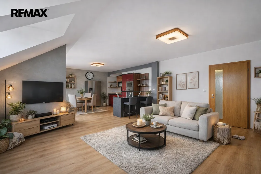 Byt se skládá z velkého světlého obývací pokoje s přímým vstupem na terasu, kde je zavedena elektřina – ideální pro grilování a letní posezení. Součástí obývacího prostoru je moderní kuchyňská linka plně vybavená spotřebiči, včetně americké lednice zn. Samsung, sklokeramické varné desky zn. BOSH, výsuvné digestoře zn. Wirlpool.