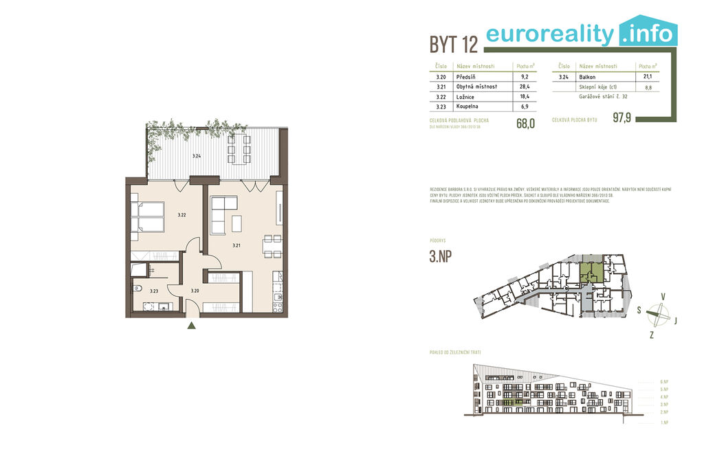 Celková užitná plocha bytu 68 m² a balkónu 21,1 m² zajišťuje pohodlné a prostorné bydlení. Se sklepní kójí o rozměru 8,8 m²