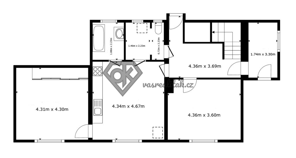 - prostorné 2+1: kuchyň, obývací pokoj, ložnice, koupelna, toaleta