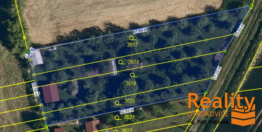 • Výměra 2 202 m², rovinný terén, šířka 29,5 m