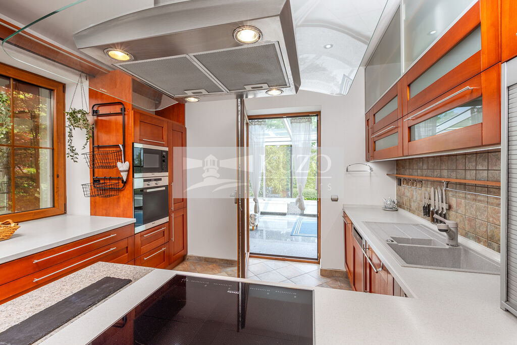 Na prostorný obývací pokoj s kuchyňským koutem plynule navazuje vytápěná zimní zahrada, která nabízí ideální prostor pro odpočinek během celého roku – ať už si užíváte ranní kávu, nebo večerní posezení s výhledem do zahrady.