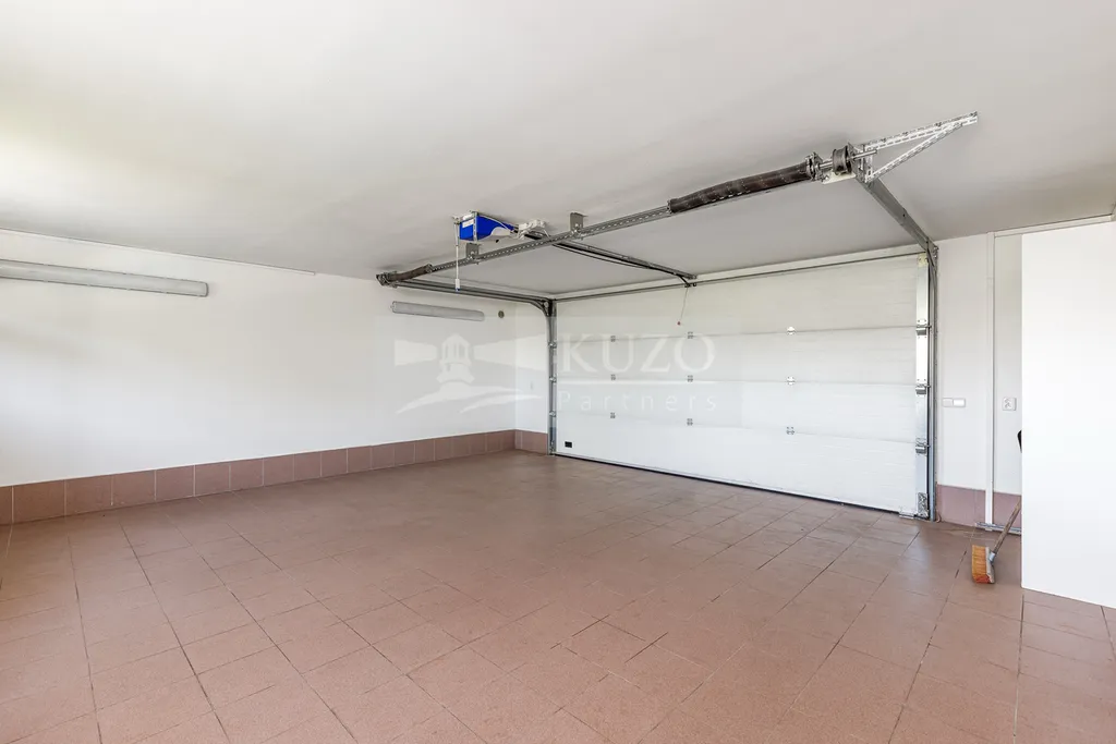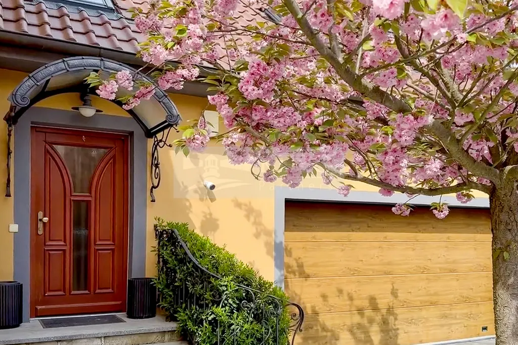Již při příjezdu vás zaujme elegantní kovaný plot s masivními žulovými sloupky, který dodává celému domu reprezentativní charakter. Dálkově ovládaná vjezdová brána otevírá přístup k prostorné dvojgaráži, která zajišťuje komfortní parkování pro dvě auta a dostatek místa pro další vybavení.